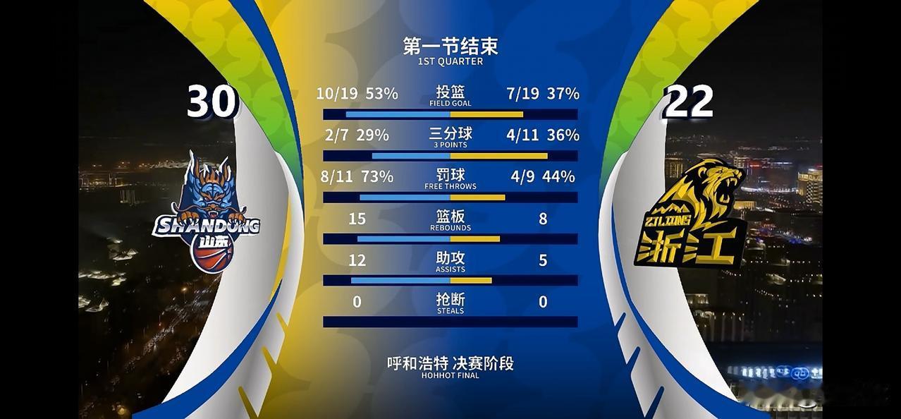 山东队已将奖杯收入囊中? CBA俱乐部杯季军争夺毫无悬念,本场比赛,残阵浙江广厦仅能派8人出战,面对仅缺少高诗岩的山东队,几乎无取胜的可能。如果对抗激烈,浙江广厦甚至有第四节派不出5人上场的危险。 首节比赛,山东被全面压制浙江广厦,投篮命中率53%:37%,篮板球15:8,比分30:22。