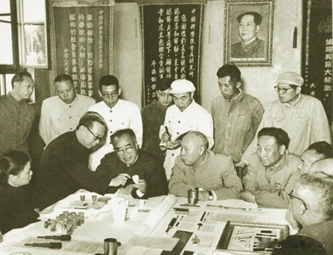 1959年,朱德和董必武在沈阳参观中国科学院金属研究所的研究成果,金属研究所所长李薰(著名物理冶金学家)正在汇报研究所的工作进展。朱德同志长期关注国防工业和科技发展,他曾强调“将来的战争是核子战争”,需要“战略的预见性”,并指出发展尖端科技对国防的重要性。