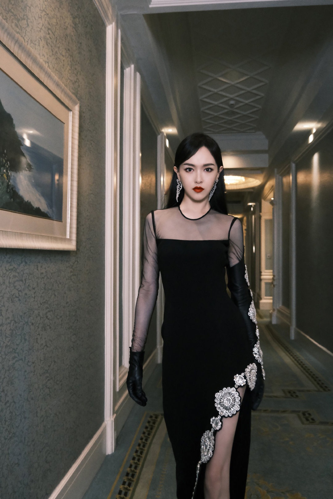 唐嫣一组好看的裙装穿搭,红唇黑纱裙大长腿,这气场超级美。唐嫣