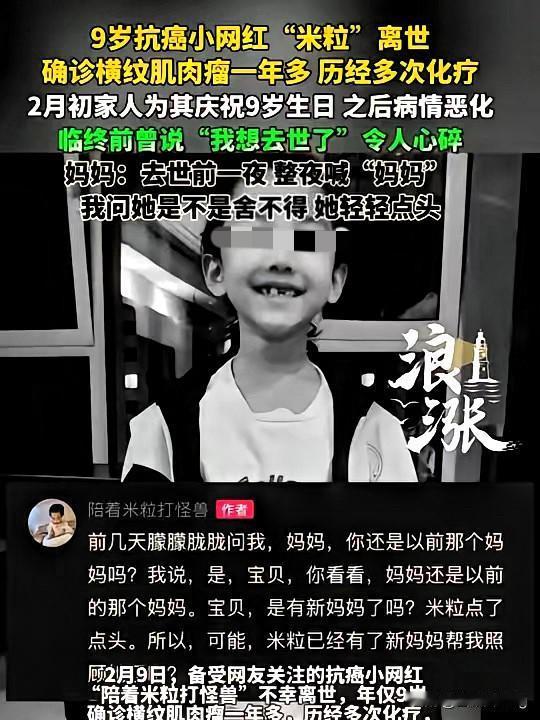 看哭全网!9岁抗癌女孩米粒走了,临终一句话戳痛所有人。 刚刚过完9岁生日的米粒,和癌症对抗了一年多,妈妈剃光头发陪她一起扛。可病痛还是带走了这个懂事的孩子,意识模糊时她问妈妈:“你还是以前的那个妈妈吗?”疼到受不了时,她轻声说“我想去世了”。 离世前夜,她整夜喊着妈妈,这是孩子对妈妈最深的不舍。妈妈说:你陪妈妈一程,妈妈念你一生。短短一句话,藏着撕心裂肺的痛。 人间最痛,莫过于白发人送黑发人。孩子不用再打针受苦了,愿天堂没有病痛,只有糖果和阳光。 你被米粒的故事打动了吗?愿每个孩子都能平安健康长大。