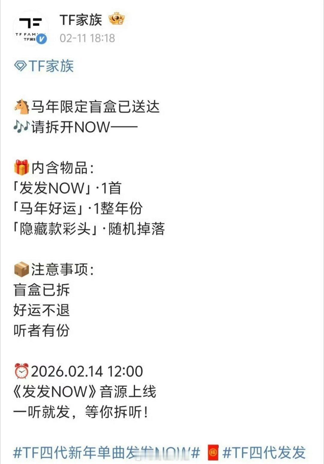 TF四代的新歌《发发NOW》在情人节当天上线啊,临近过年,一起祝大家发发发,这意