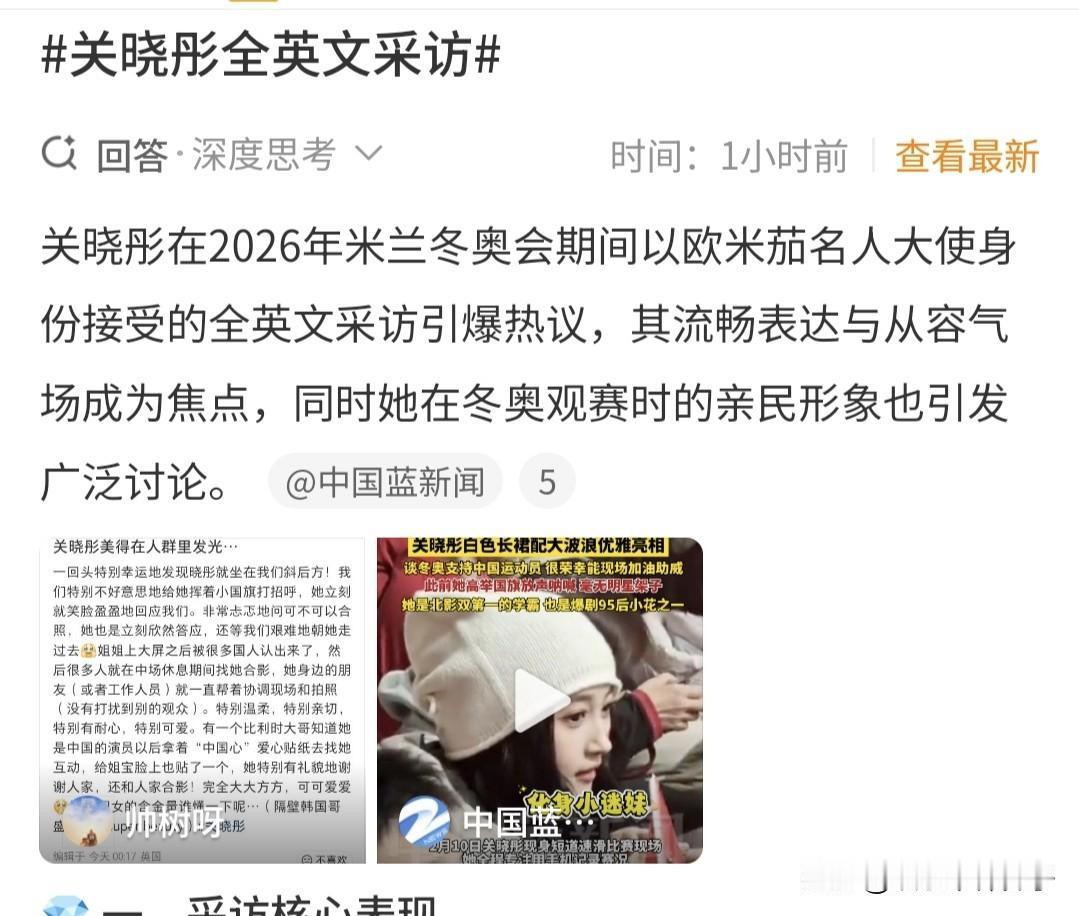 关晓彤,一天两次冲上热搜! 2月11日,一天之内,演员关晓彤两次登上热搜,并非参加综艺,更和作品无关,却让人刮目相看。 第一个原因,关晓彤现身米兰冬奥会,现场观赛,并为奥运健儿加油,期间还与王蒙合影,坦言内心很激动,中国队好棒。 第二个原因,关晓彤出席活动,接受采访时,全程用英文与主持人交流,看完视频,真的有一丝意外。 并不是说,会讲一口流利的英文就有多多么厉害,作为艺人,也算出类拔萃了,毕竟,有些明星连字都能写错,文化知识十分匮乏。 据悉,关晓彤当初以英语126分的优异成绩考入北影,这个确实很厉害,就算进入娱乐圈,还能继续学习,实属难得。 咱就说,好看的容貌千篇一律,独特的内涵百里挑一。 关晓彤观看比赛之余,以欧米茄名人大使的身份接受采访,真的闪闪发光。