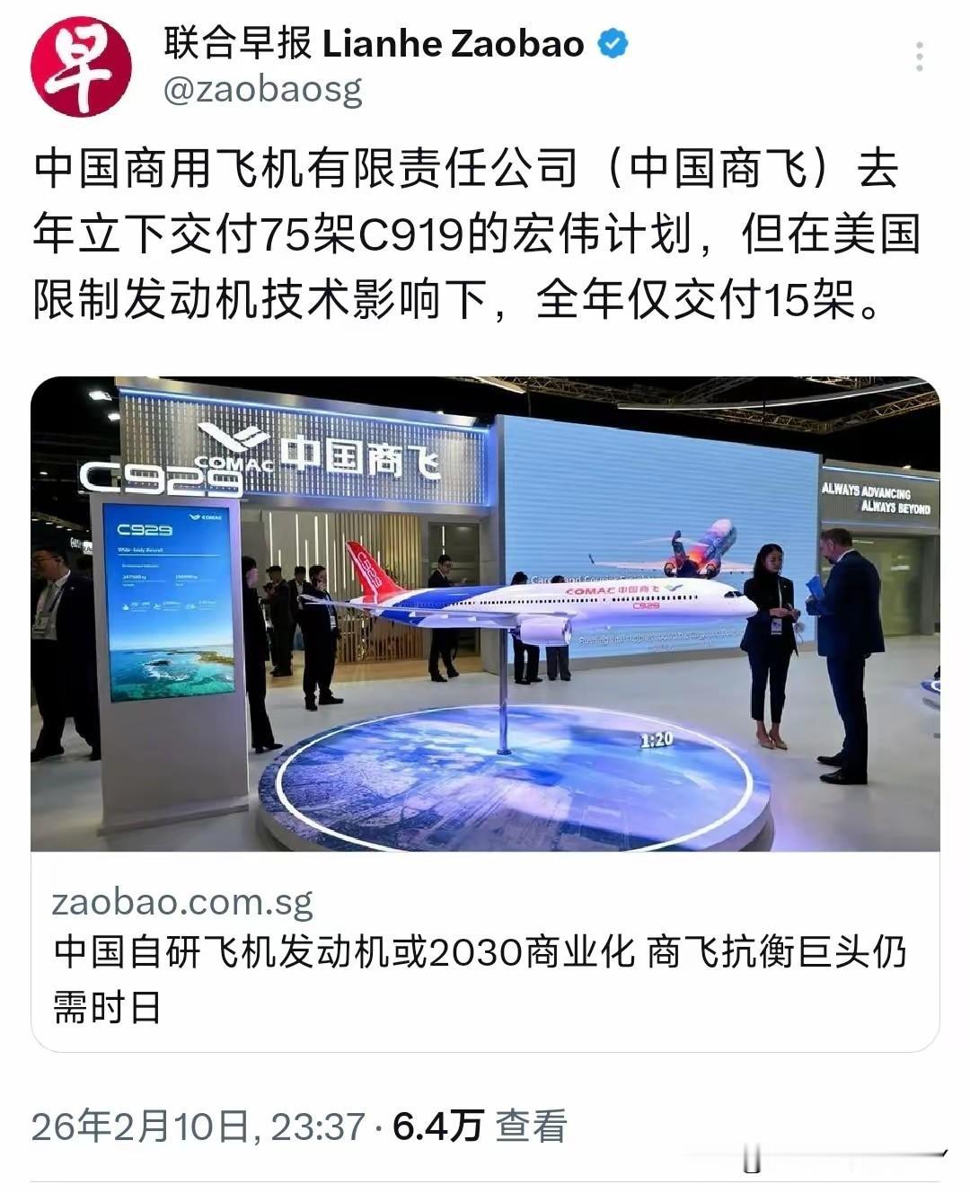 新加坡联合早报2月10日报道:“中国商用飞机有限责任公司去年立下交付75架C919的宏伟计划,但在美国限制发动机技术影响下,全年仅交付15架。” 美国即便2025年7月解了发动机禁令,可造成的延误已经明明白白摆在那儿。明眼人都看得出来,这哪是简单的技术限制?分明是冲着我们的大飞机产业来的。 想靠着核心技术攥住别人的命脉,让你迈不开步子,这种心思,藏得再深也能瞧出个大概。可他们大概忘了,中国制造业这些年的长进,从来不是顺顺当当来的。 从被卡芯片脖子,到现在的航空发动机受制于人,每一次打压,反而像给我们加了把劲。就像老话说的“越挫越勇”,你越是想把路堵死,我们越要在石头缝里踏出条道来。 所谓的“六边形战士”,哪有天生的全能?不过是被一轮轮封锁逼出来的韧劲,是在一次次碰壁后咬着牙钻研的结果。C919的交付数字里,有遗憾,更有清醒。 它让我们看清,核心技术买不来、求不来,只能自己实打实去闯。别人能给你的,也能随时收回去;只有握在自己手里的本事,才是真底气。现在的延迟,或许是为了将来更稳的起飞。 多少科研人员在实验室里熬着,多少工厂里的机床连轴转着,不就是想早点让国产航空发动机真正站起来?到那时,不管谁想再拿技术说事儿,我们都能挺直腰杆——你卡不住了,因为我们自己能造了。 这不是赌气,是生存的智慧,是发展的必然。美国的限制,看似给国产大飞机泼了冷水,实则点燃了更旺的斗志。C919承载的不只是一款飞机的梦想,更是一个国家在高端制造领域不愿再受制人的决心。 交付量少了,但志气不能短。每一次技术攻关的小突破,每一个自主零件的成功应用,都在为将来的“不受制于人”铺路。相信用不了多久,当国产发动机真正装上C919,当交付数字追上甚至超过目标时,那些曾经的封锁与打压,都将成我们成长的注脚。 毕竟,历史早就证明,我们从来不怕被卡脖子。越卡,越要突围;越压,越要拔尖。这是刻在骨子里的韧劲,也是C919们终将翱翔得更高的底气。
