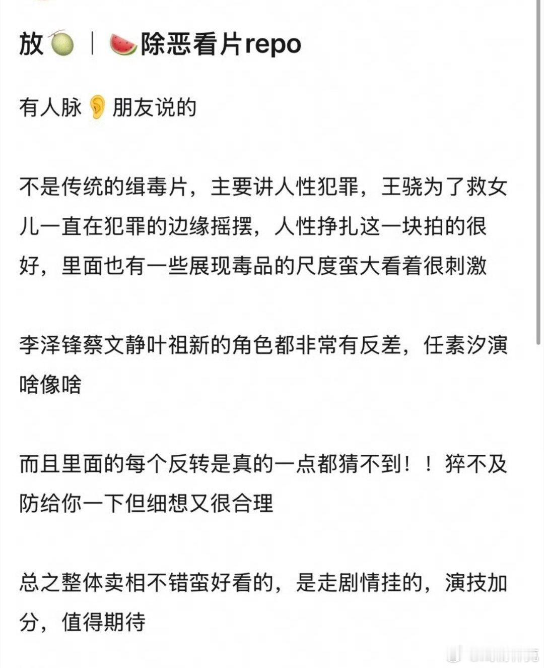 除恶repo,看起来是好评,实际很危。内娱拍某种类型片,总喜欢追求非传统,缉毒片不突出缉毒,而且又要讲人性了…这就是最大的隐雷。这和我在人之初开播前就觉得会扑是一样的道理。等除恶预告看看