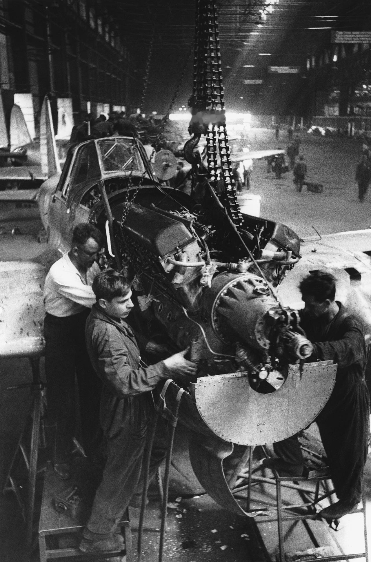 1942年,在沃罗希洛夫第18飞机制造厂的装配车间内,工人们正在为伊尔-2(Ил