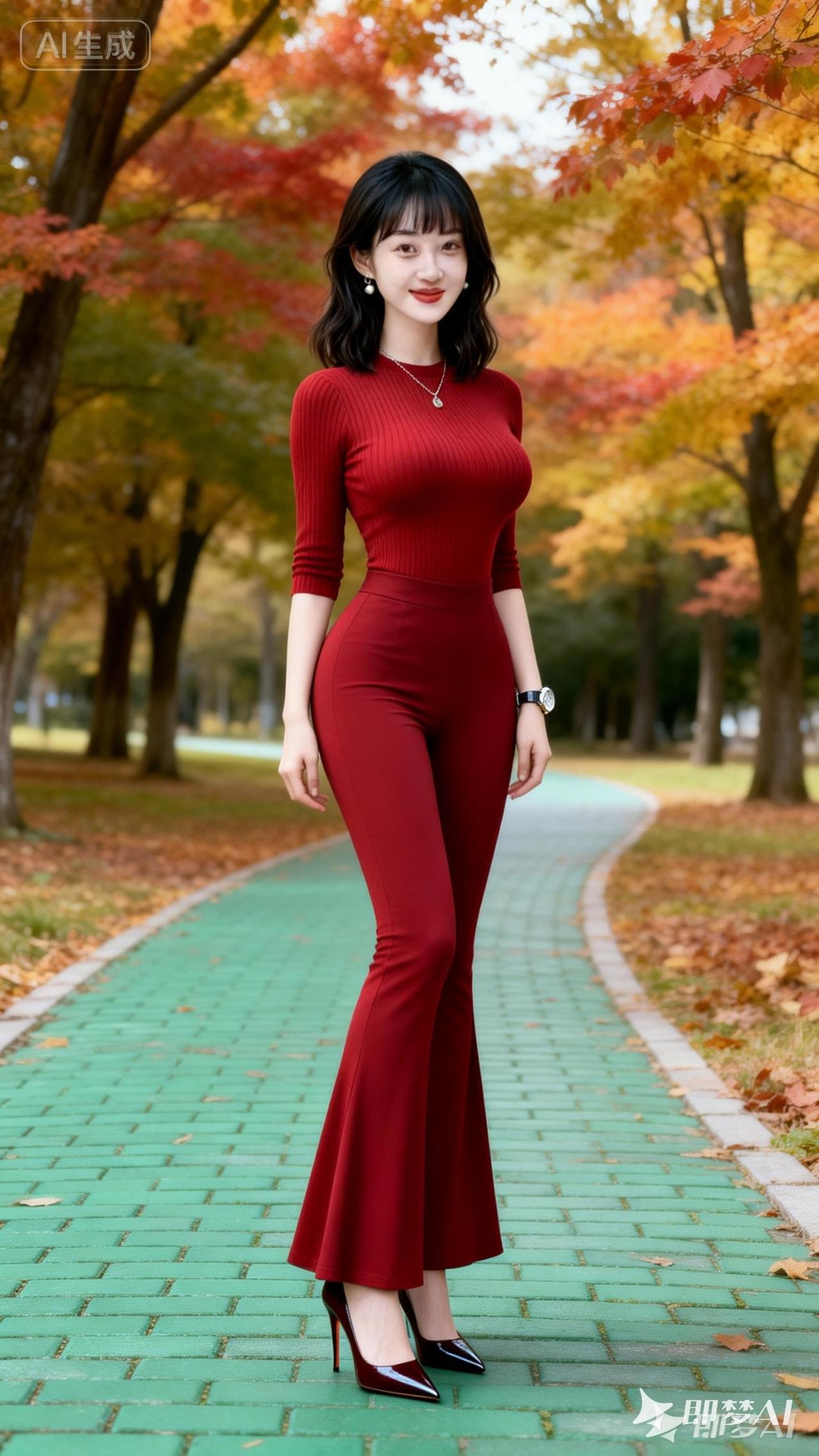 秋日红衣少女,漫步林间小道,尽显优雅与自信。