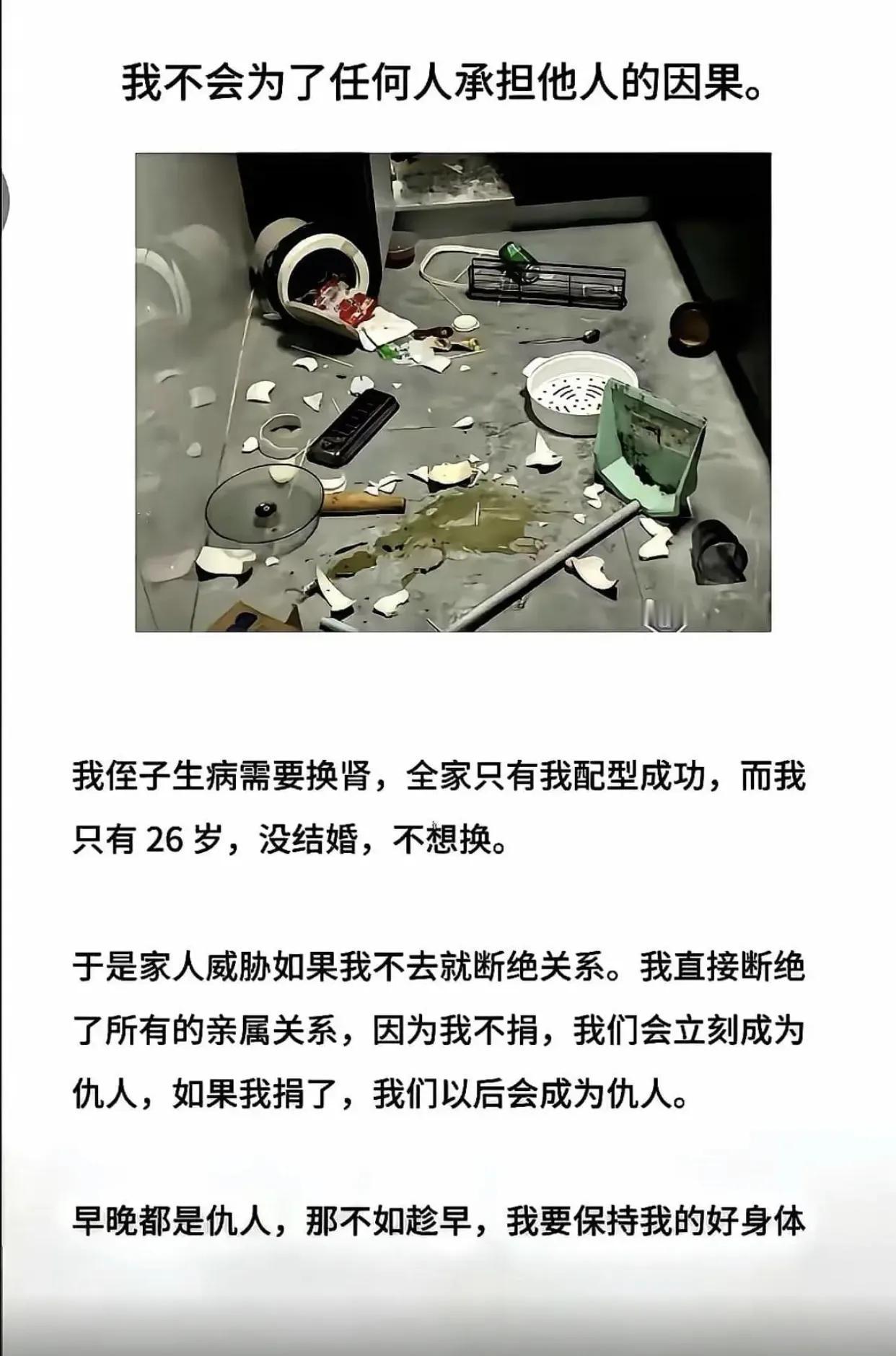 杭州26岁姑娘,因为侄子需要换肾,全家只有她配型成功。结果拒绝捐肾后,被全家人道德绑架、轮番围攻。 姑娘说得特别清楚:我才26岁,还没结婚,不想为了任何人拿自己的健康冒险。 可家人放狠话:不捐就断绝关系! 姑娘也干脆利落:早晚都是仇人,不如趁早断干净,我必须保住自己的身体。 真的太心疼了!器官捐献从来都是自愿的,没有任何人有资格逼别人捐肾。 医学数据显示,健康人捐献一颗肾脏后,剩余肾脏会承担双倍工作,长期来看会增加慢性肾病、高血压的发病概率,还会影响体力和生育相关身体状态。 国内器官移植相关条例明确规定,活体器官捐献必须遵循自愿无偿原则,任何强迫、欺骗他人捐献器官的行为都不符合规则,也违背基本伦理。 现实案例统计中,因亲属被迫捐献器官引发的家庭矛盾、健康纠纷不在少数,多数被迫捐献者后期都会出现心理压抑和身体不适的情况。 每个人都有权利优先保护自己的身体健康,亲情不能成为牺牲自我的理由,拒绝道德绑架不是冷漠,而是对自己人生最负责的选择。