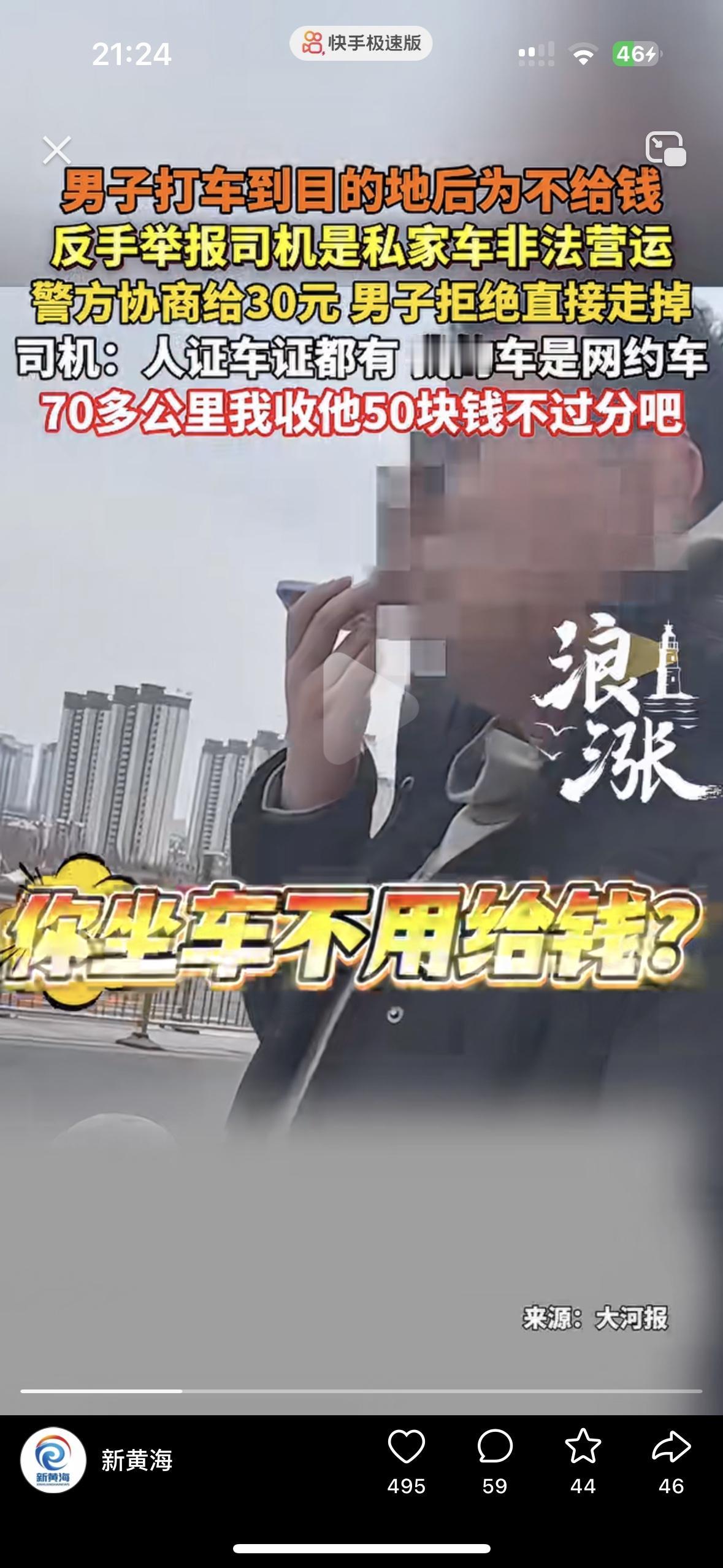 见过不要脸的,可这次真是刷新了我的认知!这是把脸揣兜里了吗? 山西一男子打车70多公里,下了车不想给钱,突然耍赖,还理直气壮的让司机报警 司机师傅拦着他不让走,他却恶人先告状,举报司机非法运营是私家车,想用这招逼司机妥协。可没想到警察来了,发现司机证件齐全,不存在他说的非法运营。民警调解后,司机师傅做出了让步,给30就行,没想到他甩开司机师傅的手,头都不回的走了,气的司机师傅当场骂他:穷死你了 坐车给钱天经地义,为了这几十块钱连脸都不要了!你觉得这男的做的对吗?评论区留言
