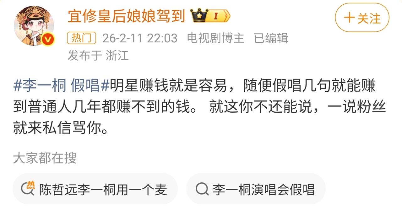 假唱不是说娱乐圈不让在大型舞台上假唱了吗? 2026湖南卫视小年夜春晚直接出大瓜! 李一桐和陈哲远合唱《我想要占据你》的时候被网友发现假唱。 明明歌声都清晰飘出来了,李一桐的话筒还没举到嘴边,声画不同步的画面太明显。 说实话,我都没弄明白假唱的意义在哪。你要不想唱就干脆出来露个面,摆几个动作得了 拿个话筒假装唱,糊弄谁呢?