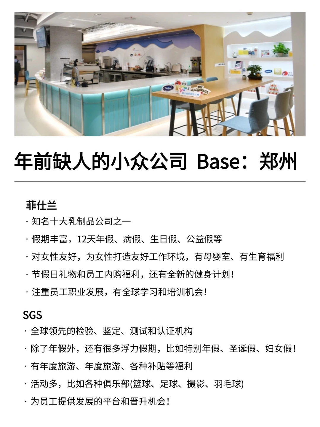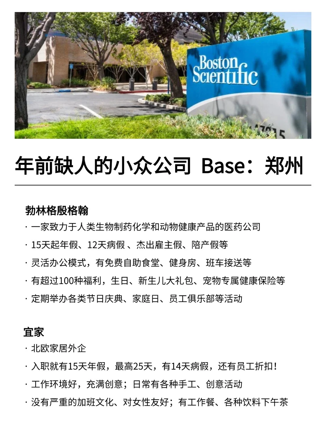 郑州发展真的越来越好,有不少小而美、冷门宝藏的公司,机会是真的很多的! 特别是有不少小众冷门的外企,真心建议大家可以去试试 · 大家不要觉得外企很难进 其实外企也有一些常规类、英语要求没有那么高的岗位 · 为什么还是值得去外企? ▪️氛围好,对女性友好,年假长,基本上都是10天起步 ▪️很多还都支持居家办公、福利完善,是真的能实现WLB ▪️待遇也还不错,年后找工作的真的可以考虑考虑~ · 坚持日更✊🏻,帮大家在找工作路上顺利拿 offer! ·