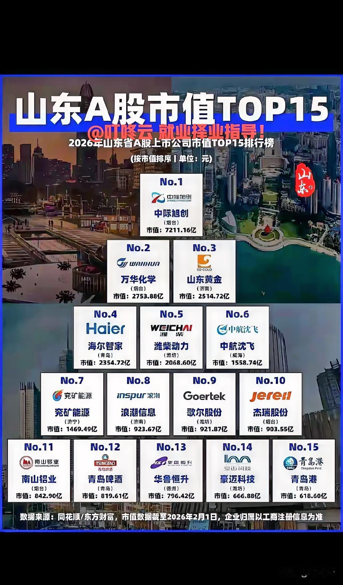 王者来了!山东省A股市值排行榜前15名揭秘!排行榜榜宝座Top5是:中际旭创、万华化学、山东黄金、海尔智家、潍柴动力!以2026年2月2日数据为准!你觉得还有哪些市值较高的企业,欢迎评论区补充和留言交流讨论!速速围观揭秘详细内容![福][福][烟花][烟花] 欢迎关注@叮咚云 将优先为粉丝职业规划指导,1对1咨询是付费服务,为你定制最适合的就业择业方案!欢迎留言交流讨论。[来看我][来看我] 免责声明:图片来自网络,仅供参考!