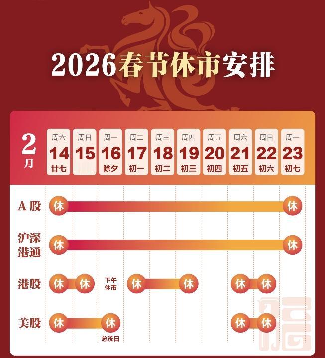 临近过年,咱们大A也要休市啦。下面来了解一下A股春节休市安排,从2月14日到2月23日,足足有10天时间。不过,港股休市的时长要短一些,喜欢冒险的朋友不妨提前布局。