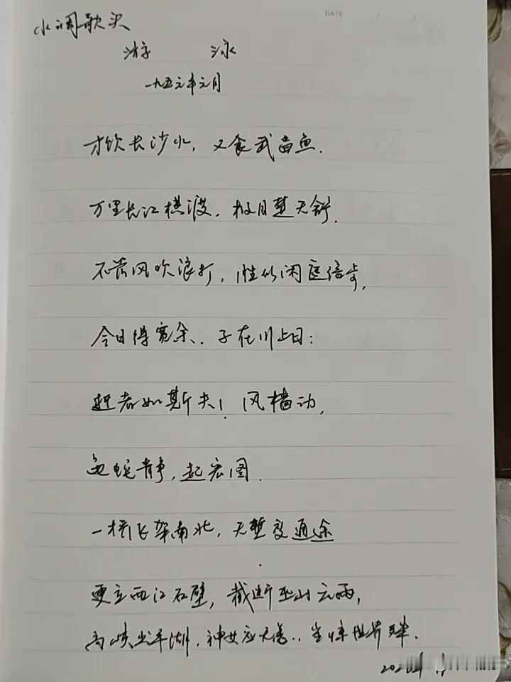 抄书第 1085天(2026年2月11日) 静心✔ 戒浮躁,一笔一划。 今天继续抄《毛泽东诗词集》之《水调歌头·游泳》。 这是1956年毛主席在武汉三次畅游长江期间创作,首次发表于《诗刊》1957年1月号。 上阙借“闲庭信步”抒征服天险的从容,下阙“一桥飞架”写在建的武汉长江大桥,“高峡平湖”则提前17年预言了三峡工程。 这首词最独特处在于:它既是写实纪游,又同时定格了三个时态—— “一桥飞架”是进行时。“高峡平湖”是将来时。“逝者如斯夫”是全词哲学支点。自抄诗词 抄书打卡 抄书 抄抄书 练练字 静静心