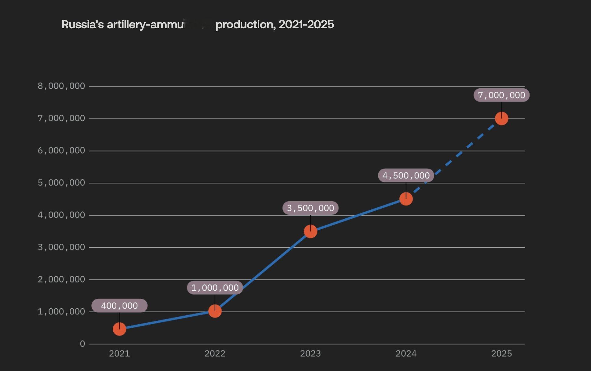 2021-2025:俄罗斯炮弹年产量从40万枚增长到700万