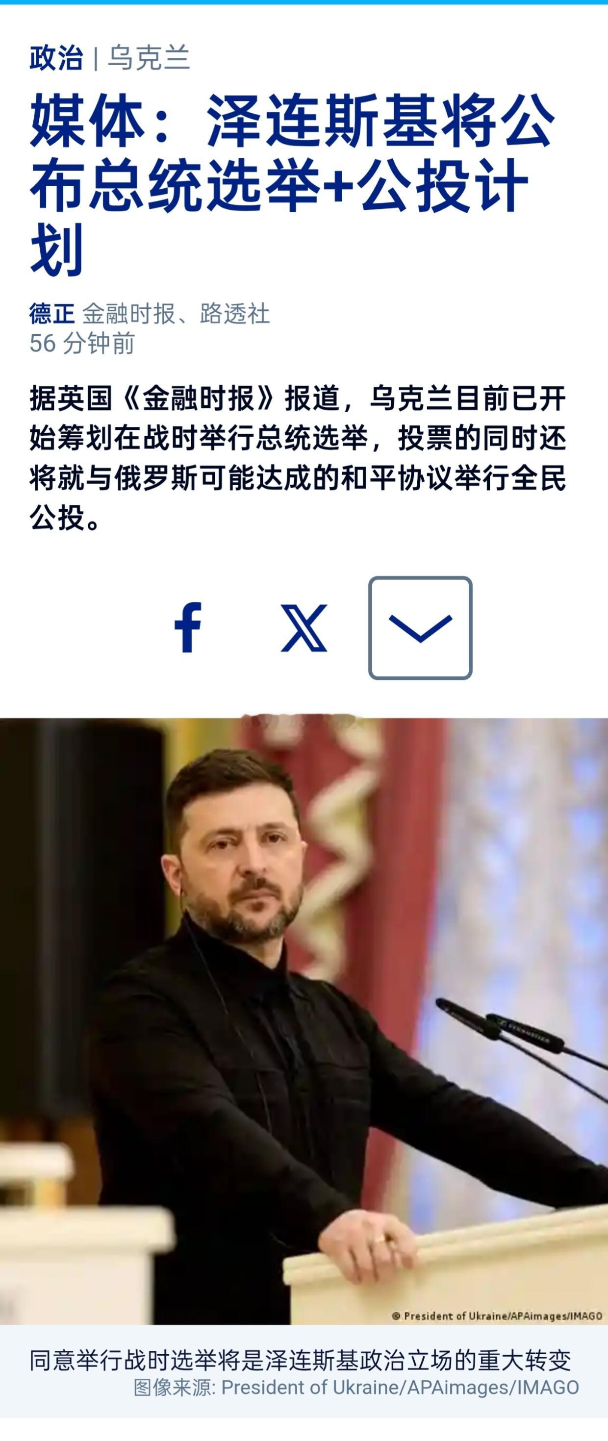 据英国FT报道,据乌克兰和欧洲官员透露,乌克兰总统泽连斯基计划宣布春季举行总统选举和和平公投的筹备工作。该报称,计划细节将于2月24日公布。