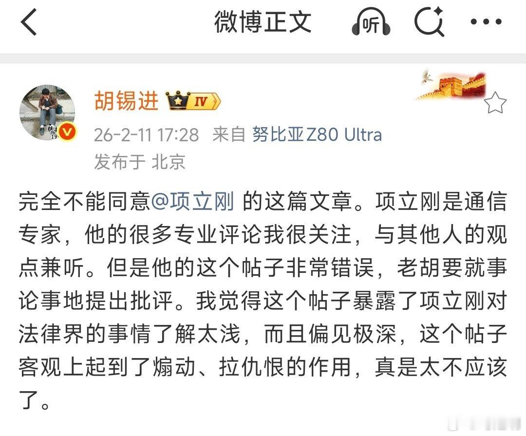 胡锡进老师在大是大非的问题上,还是靠得住的。项立刚老师还是待在“通讯领域”边好好