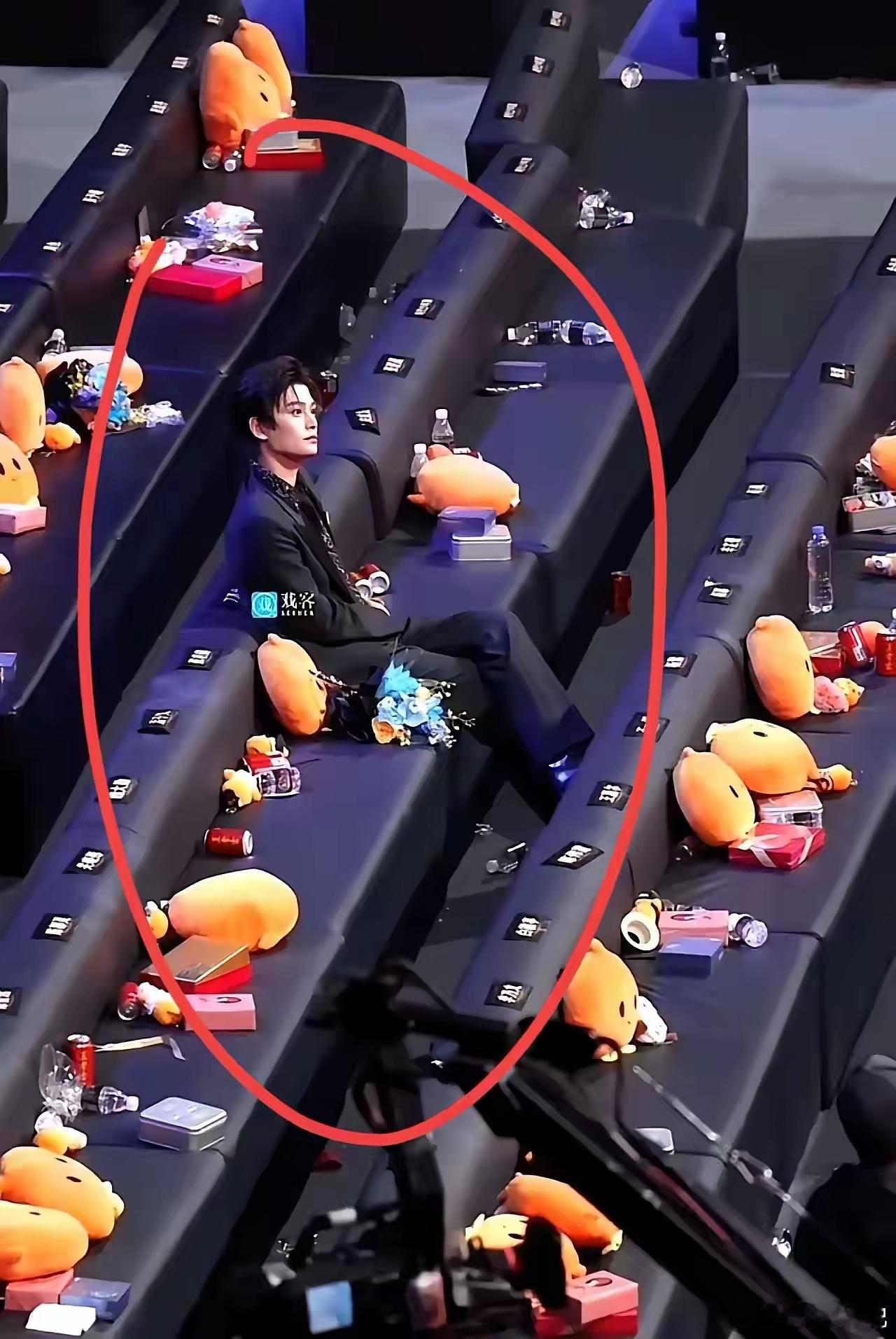 周围的人都走了,他还没走,这是哪位明星啊!挺能坐得住的。