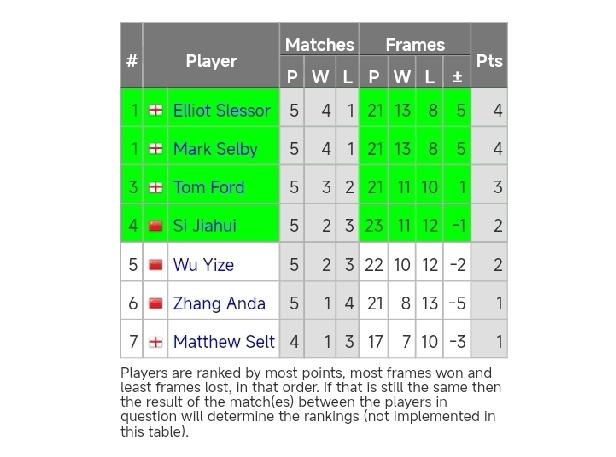 吴宜泽 3-2 斯佳辉 2月11日,斯诺克冠军联赛胜者组小组循环赛第二天比赛,斯佳辉对阵吴宜泽。 斯佳辉两胜两负排名小组第四,张安达1胜四负排名小组第五,吴宜泽一胜三负排名小组第六。 三名中国球员争夺小组出线权。斯来塞、塞尔比已经小组出线。