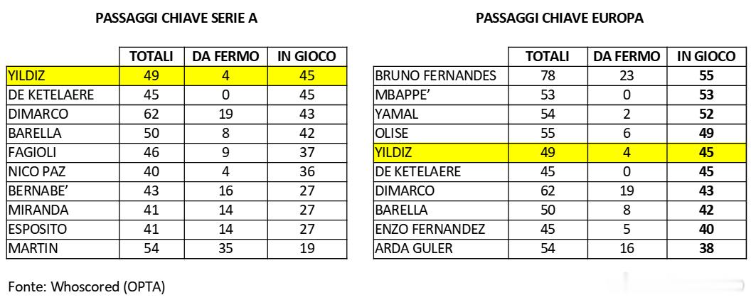 除了是那些凭借运球和射门“独自”创造机会最多的球员之外,伊尔迪兹是意甲联赛排名第一、欧洲五大联赛排名第五的关键传球手(导致射门的传球)。