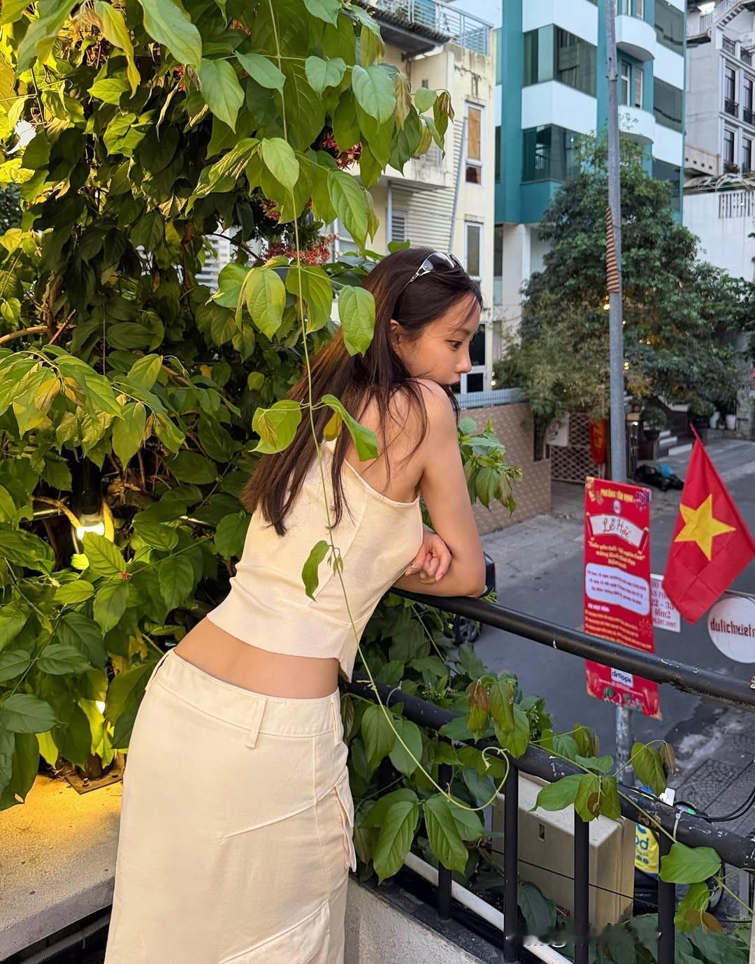 阳光洒在发梢,少女倚栏微笑漂亮小姐姐