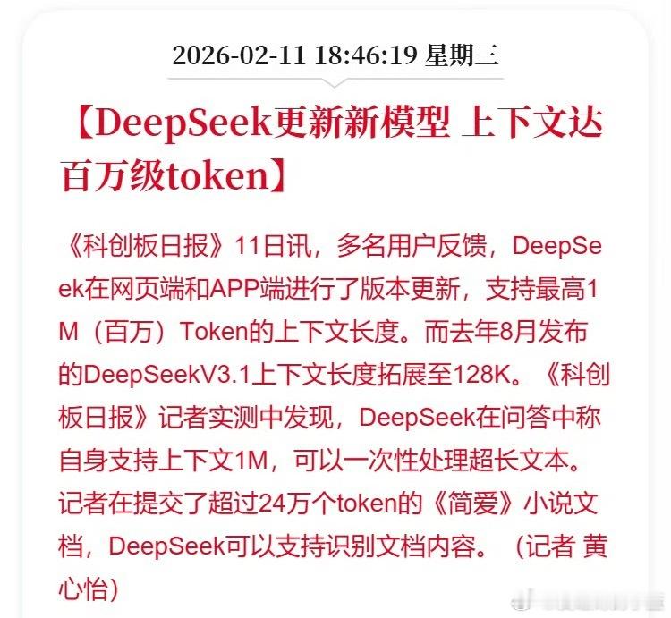 DeepSeek更新新模型上下文达百万级token