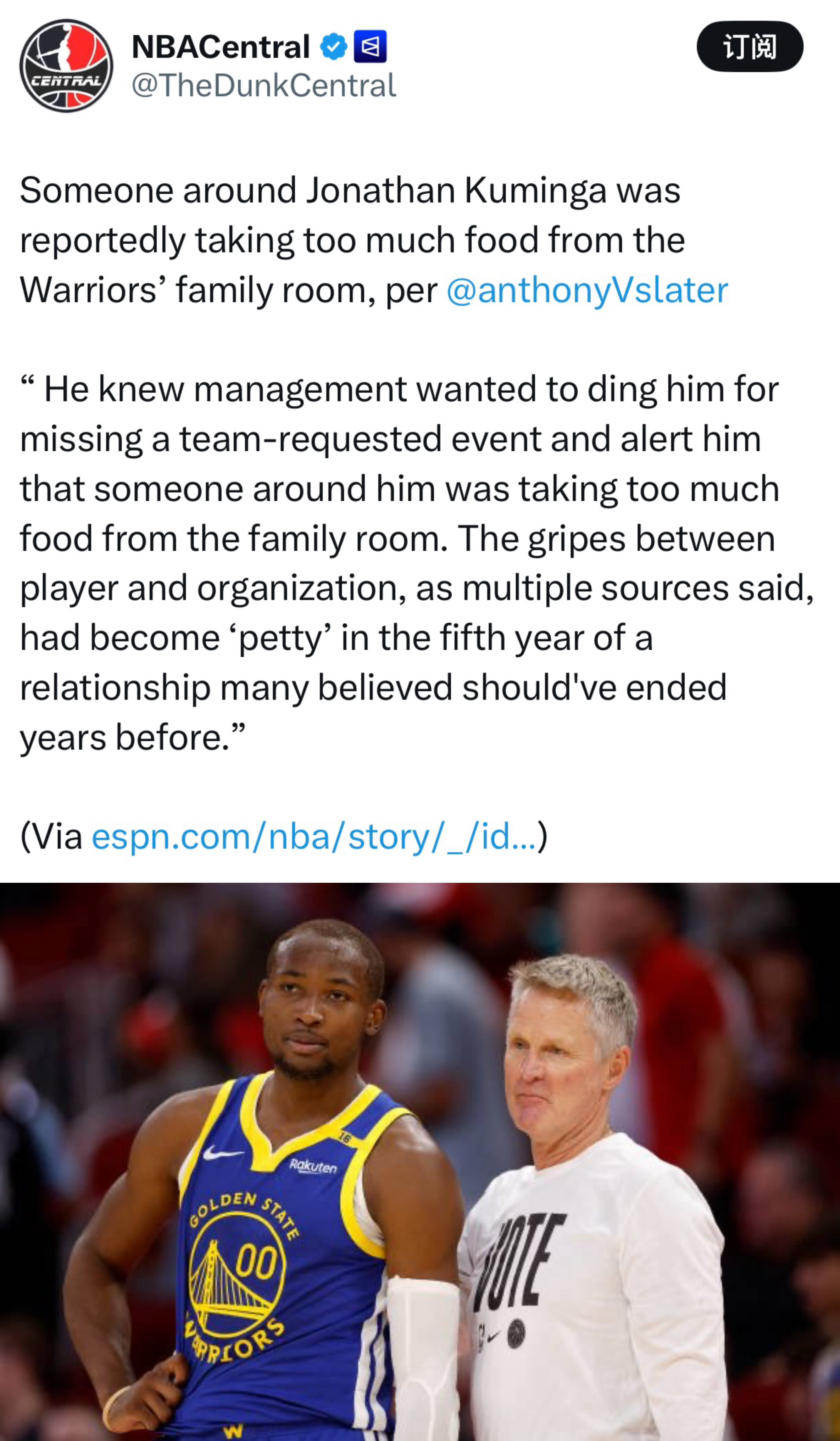 勇士记者Slater:库明加知道勇士管理层要因为他缺席球队安排的活动而处罚他,同时还要提醒他:他身边有人从球队家属休息室拿了太多食物。