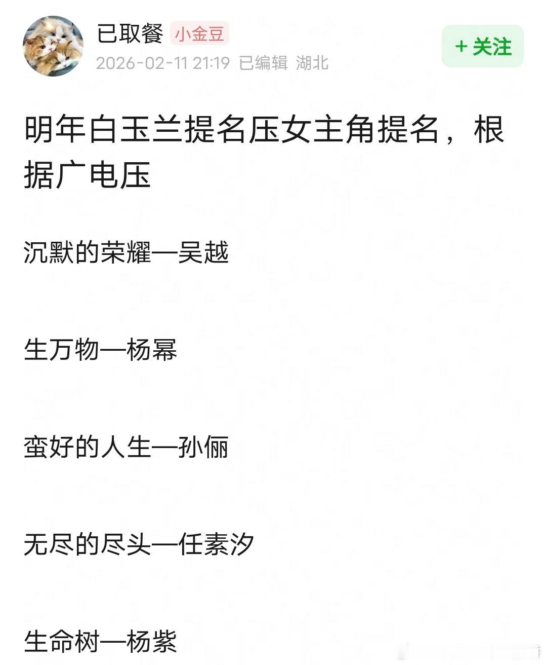 根据广电年鉴,网友预测的白玉兰视后提名杨幂《生万物》孙俪《蛮好的人生》杨紫《生命树》吴越《沉默的荣耀》任素汐《无尽的尽头》