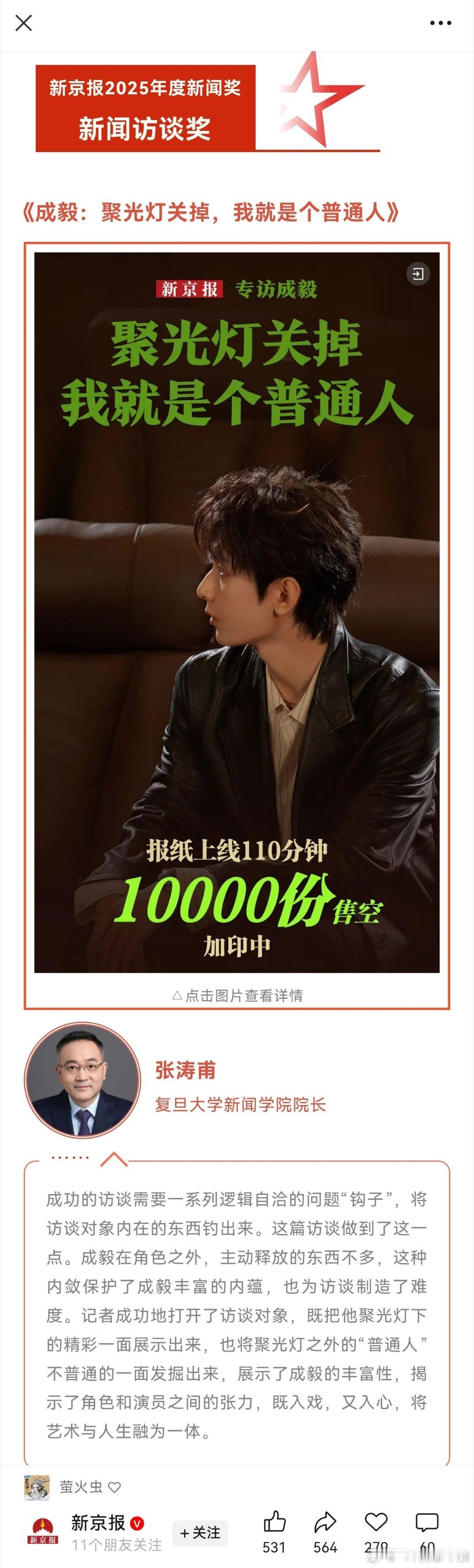 新京报成毅专访获新闻访谈奖聚光灯下,他是用心诠释每一个角色的演员,他用细腻表演勾勒人物风骨,以角色传递侠义与温柔;聚光灯外,他是坚守本心的普通人,低调沉淀,认真生活,把热爱藏在细节,把坚持刻进日常。他说,要坚持做自己认为对的事,要在人生的选择里多一点勇气、包容与舍得;他说,希望粉丝能从他的生活态度里,找到属于自己的人生答案,活成独属于自己的光。追星是一场温柔的奔赴,更是一次并肩的成长。愿我们也如他一般,静下来沉淀自己,拼起来坚定向前,在自己的领域里认真耕耘,在生活的点滴中保持温柔与纯粹。好好爱自己,好好生活,好好奔赴属于自己的人生。戏播时,我们共赏角色的精彩;生活里,让喜欢成为动力,让陪伴化作力量,彼此守护,各自精彩,这便是最好的双向奔赴❤️ 成毅