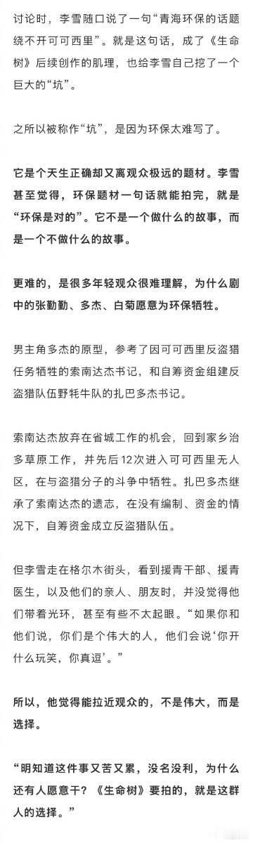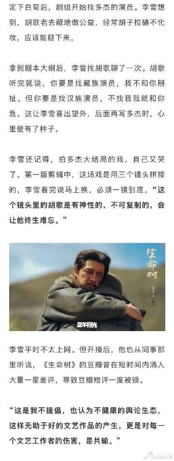 导演回应生命树豆瓣一星差评 导演回应很真诚,胡歌主动想参演,全体主创用心打磨作品,急播是配合自然保护区条例,戏里戏外都在守护生态