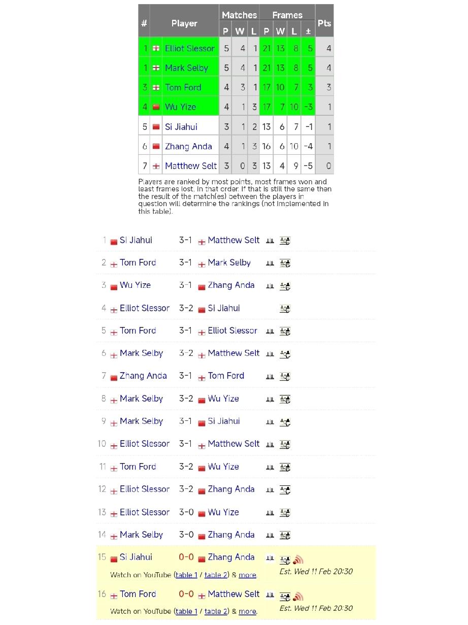 斯佳辉 1-1 张安达 2月11日,斯诺克冠军联赛胜者组小组循环赛第二天的比赛。目前战绩是斯佳辉1胜2负、张安达1胜3负。张安达输斯佳辉,基本上小组就就淘汰了。