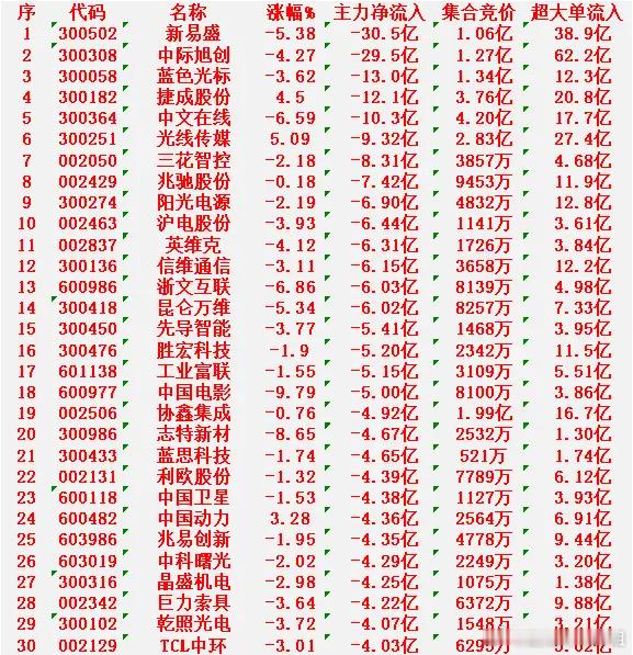 新易盛:净流出 30.5亿元中际旭创:净流出 29.5亿元蓝色光标:净流出 13.0亿元捷成股份:净流出 12.1亿元中文在线:净流出 10.3亿元光线传媒:净流出 9.32亿元三花智控:净流出 8.31亿元兆驰股份:净流出 7.42亿元阳光电源:净流出 6.90亿元沪电股份:净流出 6.44亿元