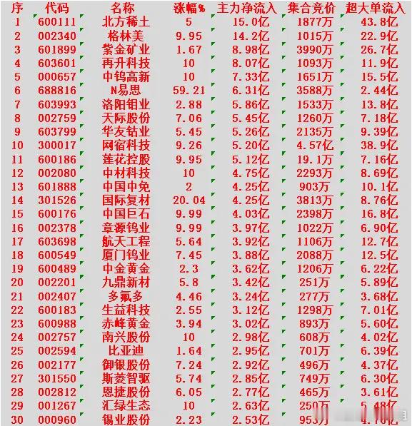 北方稀土:净流入 15.0亿元格林美:净流入 14.2亿元紫金矿业:净流入 8.98亿元再升科技:净流入 8.07亿元中钨高新:净流入 7.33亿元N易思:净流入 6.31亿元洛阳钼业:净流入 5.86亿元天际股份:净流入 5.45亿元华友钴业:净流入 5.26亿元网宿科技:净流入 5.20亿元莲花控股:净流入 5.12亿元中材科技:净流入 4.75亿元中国中免:净流入 4.25亿元国际复材:净流入 4.25亿元中国巨石:净流入 4.03亿元章源钨业:净流入 3.97亿元航天工程:净流入 3.92亿元厦门钨业:净流入 3.88亿元中金黄金:净流入 3.62亿元九鼎新材:净流入 3.42亿元