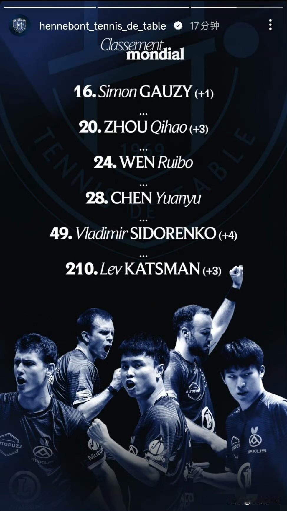 本周国际乒联世界排名更新,亨尼邦俱乐部几位选手的世界排名📷 西蒙·高茨WR16 周启豪WR20 温瑞博WR24 陈垣宇WR28 西多仁科WR49 卡特斯曼ER210 2026.2.11