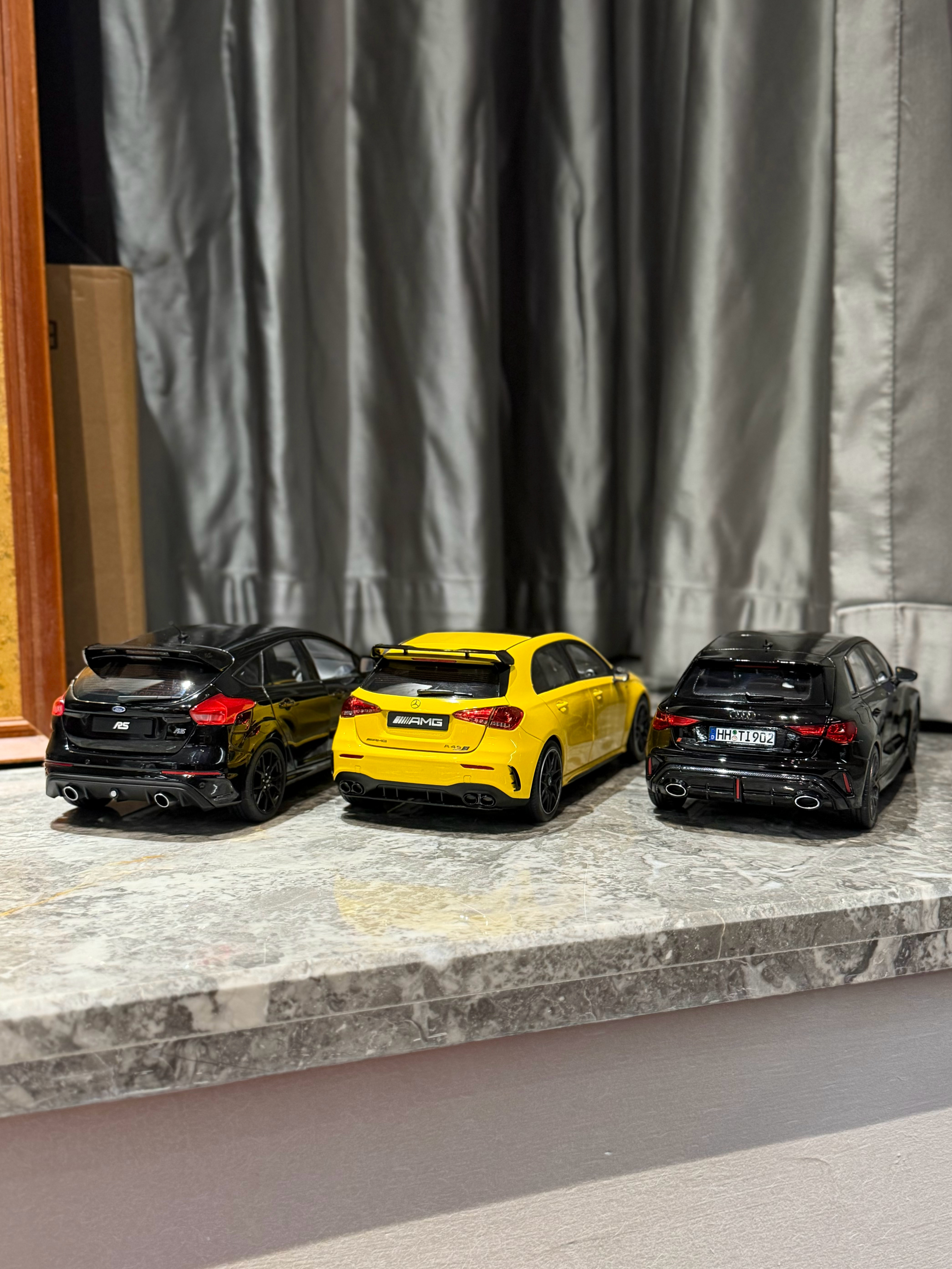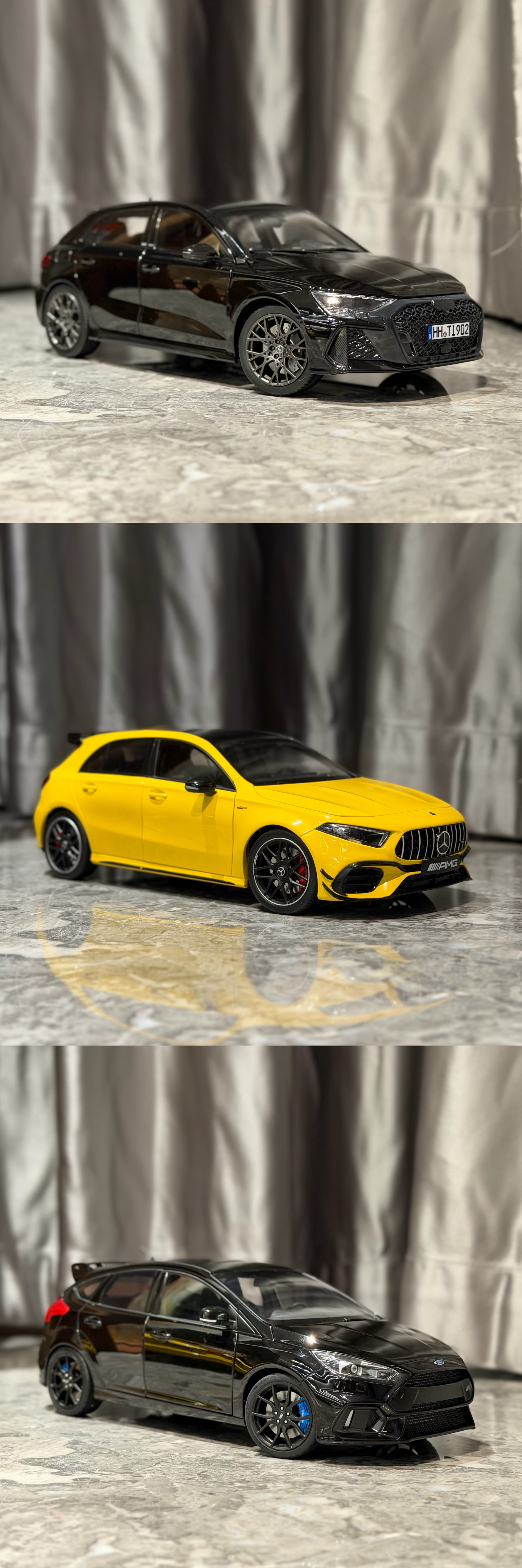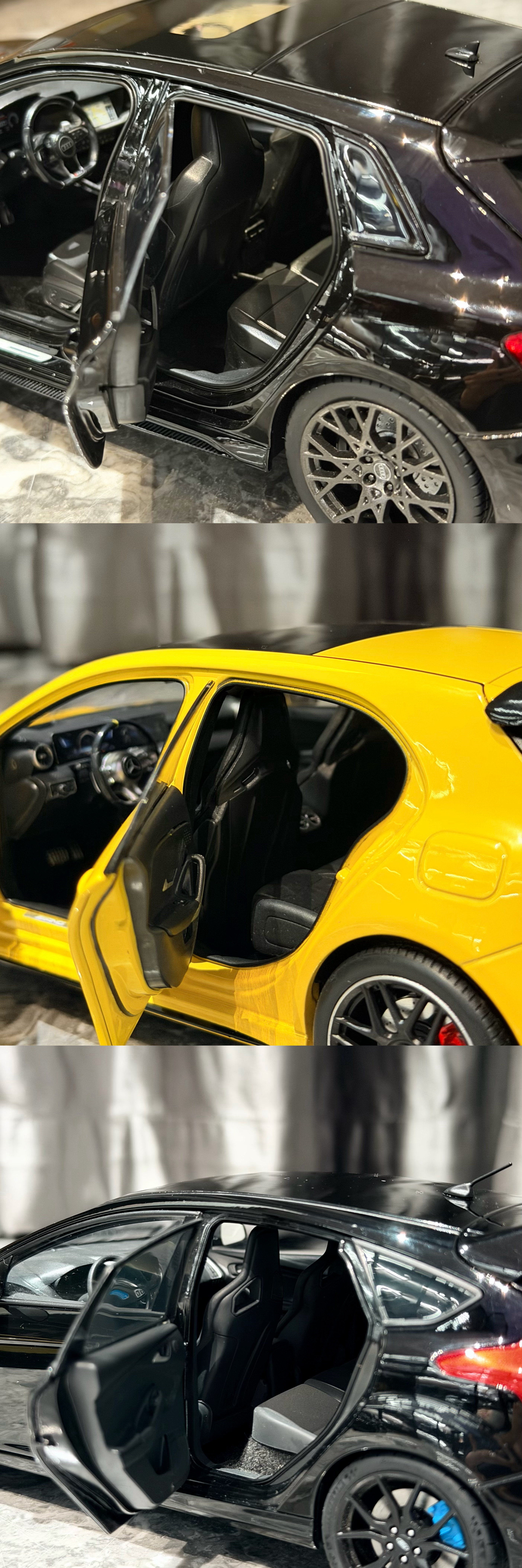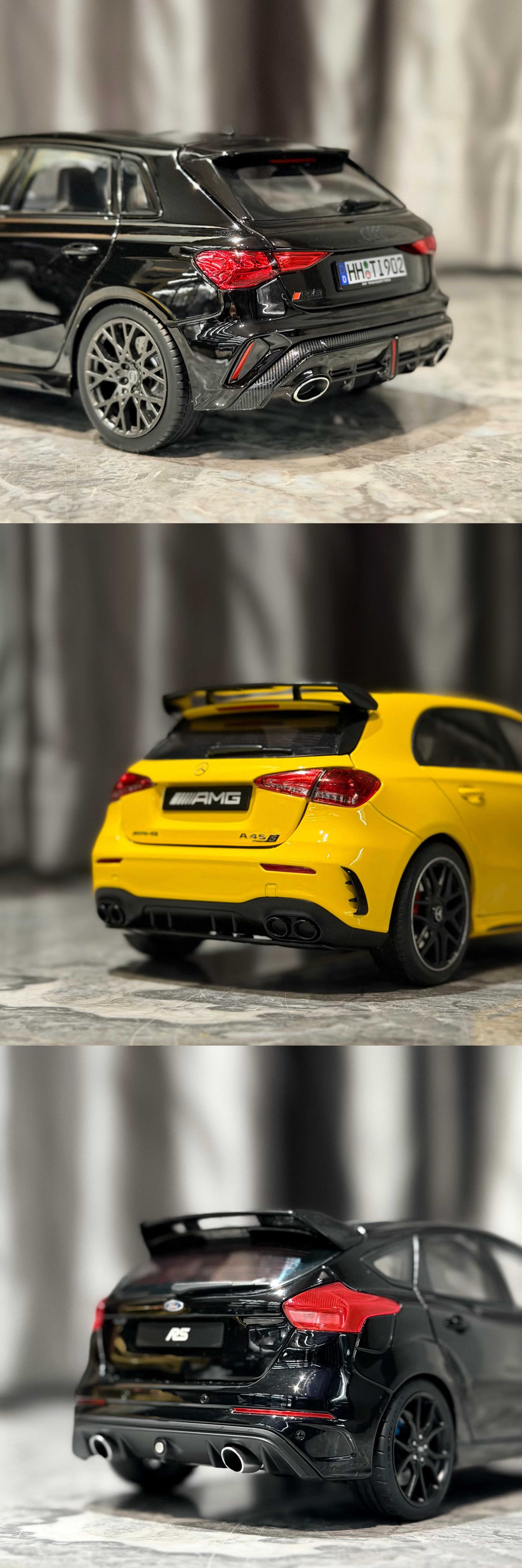 Sergio的摄影库 模型分享PT57-1/18全开的几台小钢炮们18全开小钢炮们在市场上陆陆续续越来越多了,对于我们这种喜欢小钢炮的人来说真是开心Norev这台最新一代的RS3出的很出乎意料,也很惊喜,这一代RS3的设计一直深得我心,且纽北还能出成绩,虽然实车不进国内,但起码能收到模型了做工中规中矩,颜色目前只有这个黑色,不过不到5张的价格真的香齐辉这个A45S应该算是这三台里面热度最高的,出到现在也陆续刷了不少颜色,做工也就正常齐辉水准,外观缝隙略大,方向盘的银色分色感觉分多了,有点怪,不过整体内饰质感,还有一些细节处理还不错,而且拿在手里贼有分量,比较加分而福克斯RS作为AA出品,毋庸置疑外观工整度肯定是三台车最高的,看着就舒服,不过这台车的内饰AA居然少做了一个三连表,也是真的离谱,但好在这车现在也特价了,7张不到的价格收型还是不错的