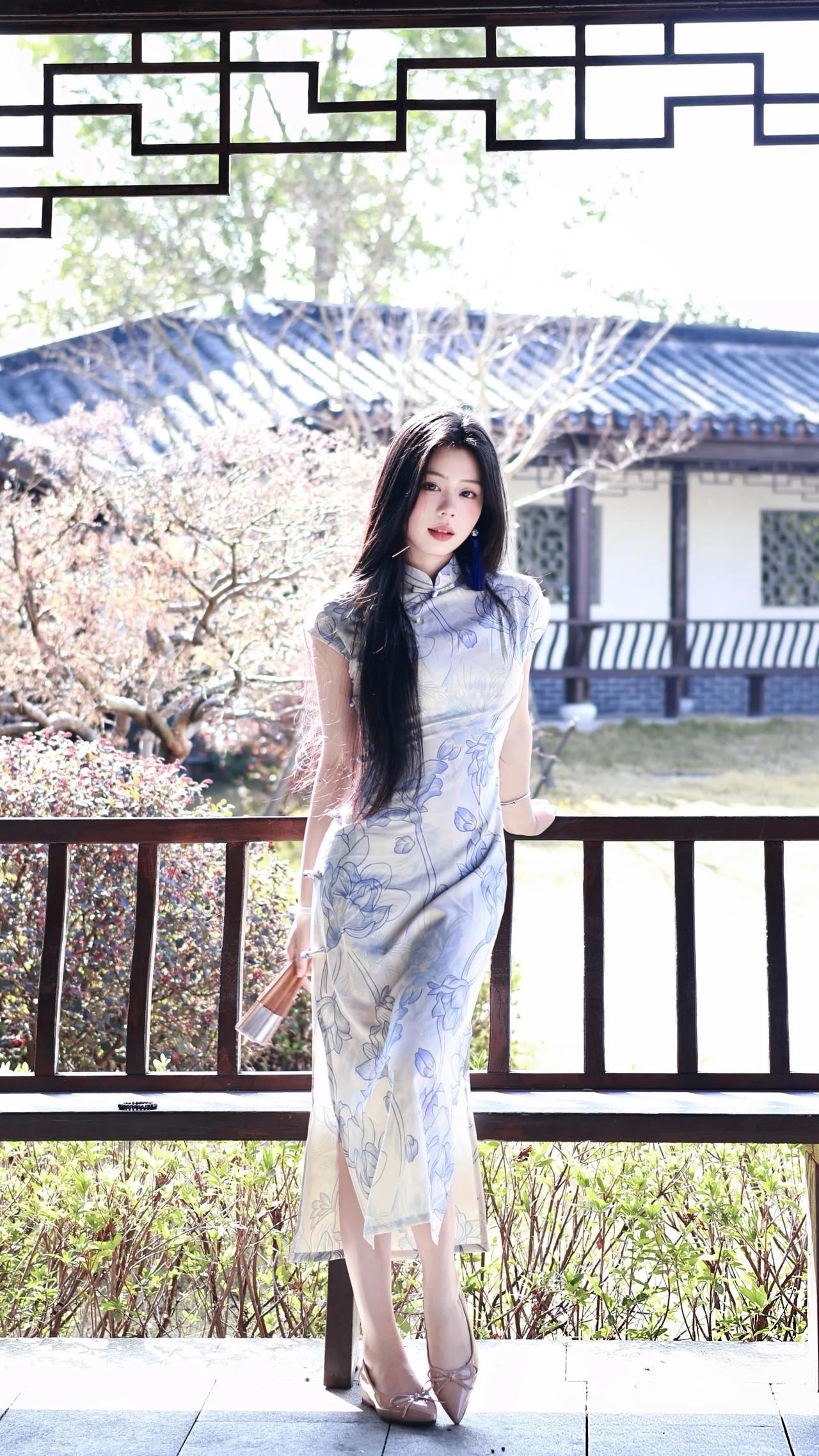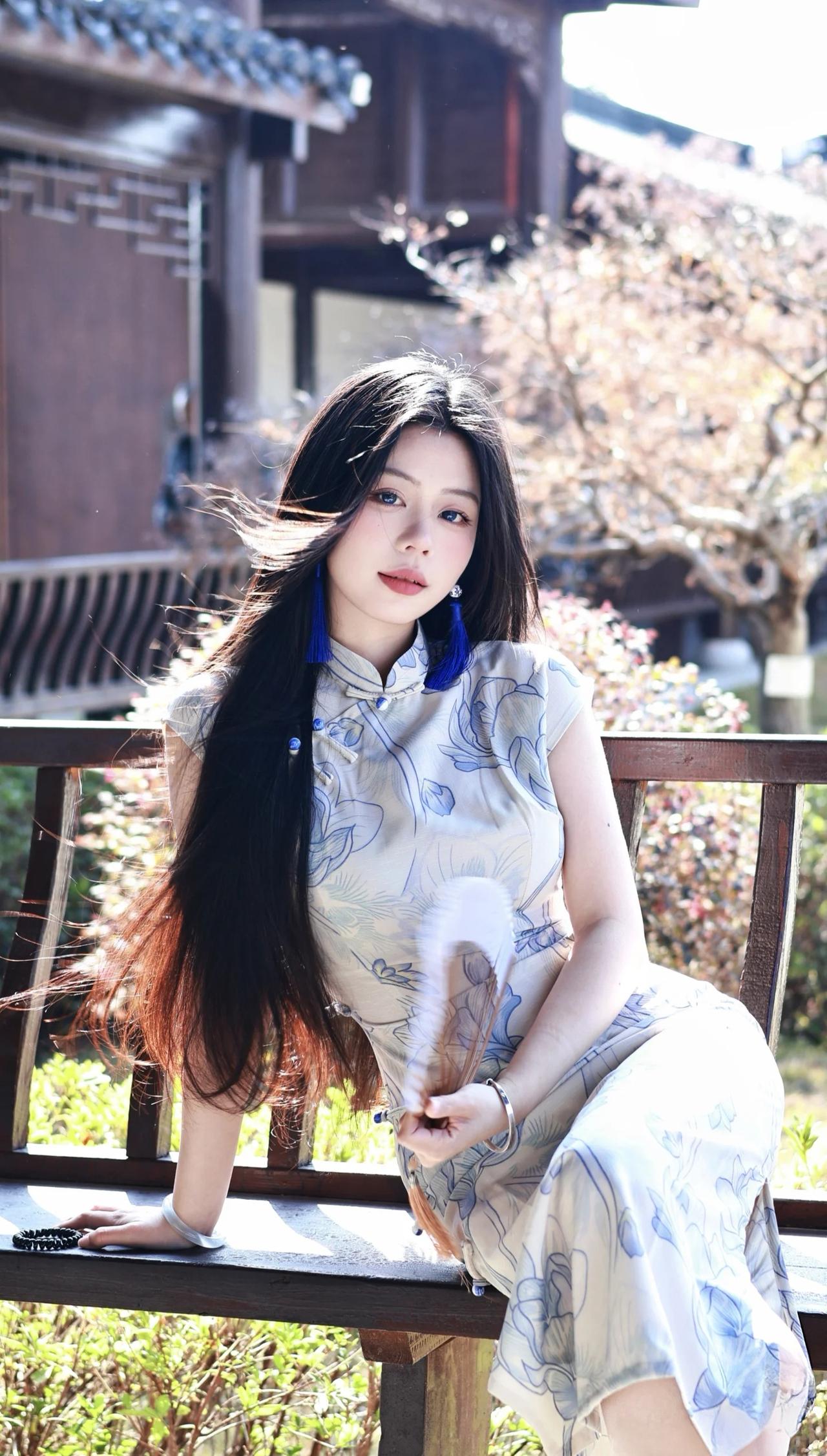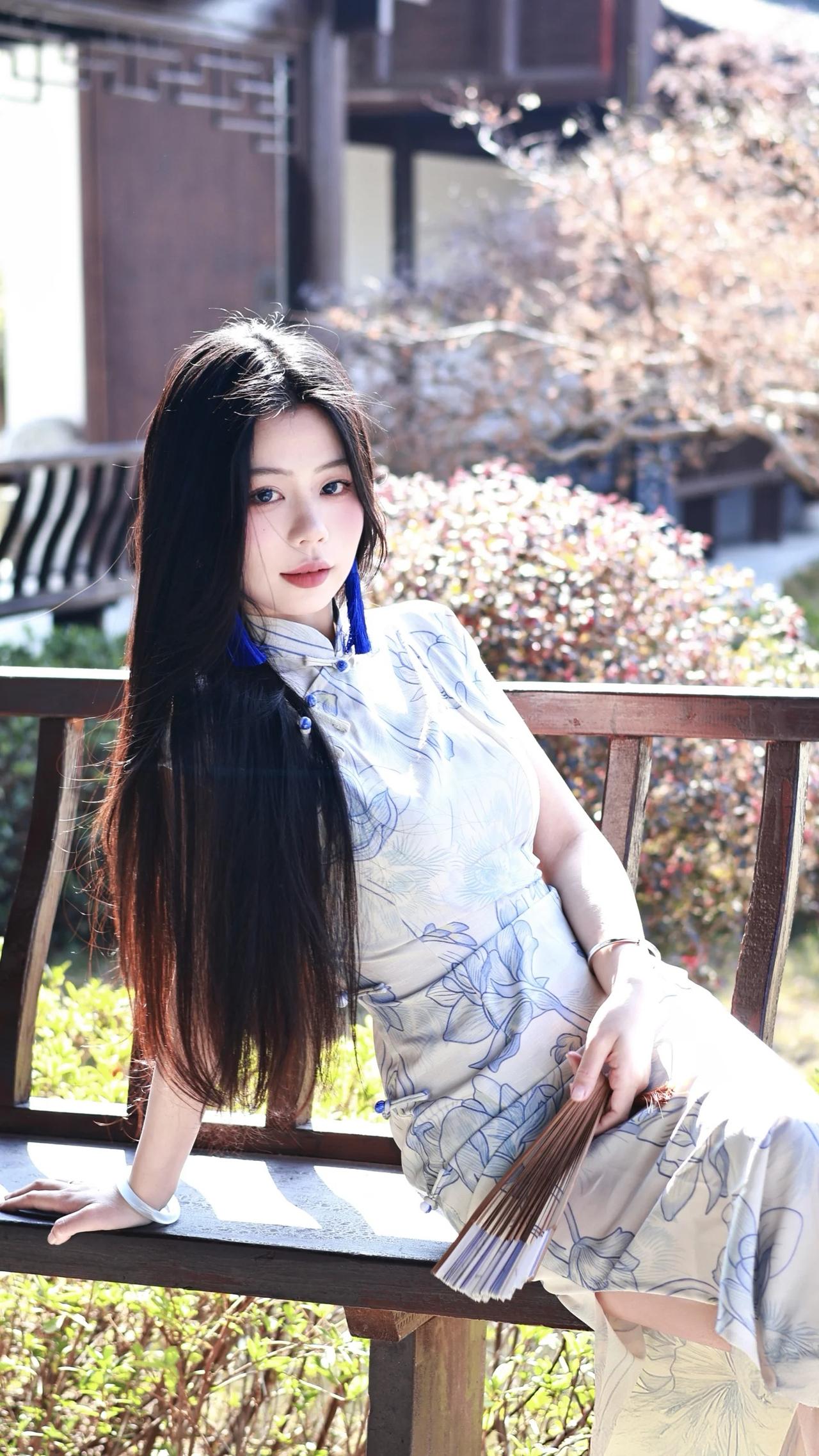 女子身穿浅底蓝花旗袍,搭配蓝色流苏耳饰与浅色高跟鞋,手持折扇,或倚栏、或坐 bench、或回眸,姿态柔美。背景中的中式窗棂、瓦顶与绿植相映成趣,营造出“人在画中游”的古典美感。 这组写真不仅展现了旗袍的东方韵味,也通过光影与构图传递出一种温婉、静谧的审美意境,适合用于文化宣传、个人写真集或传统节日主题内容。