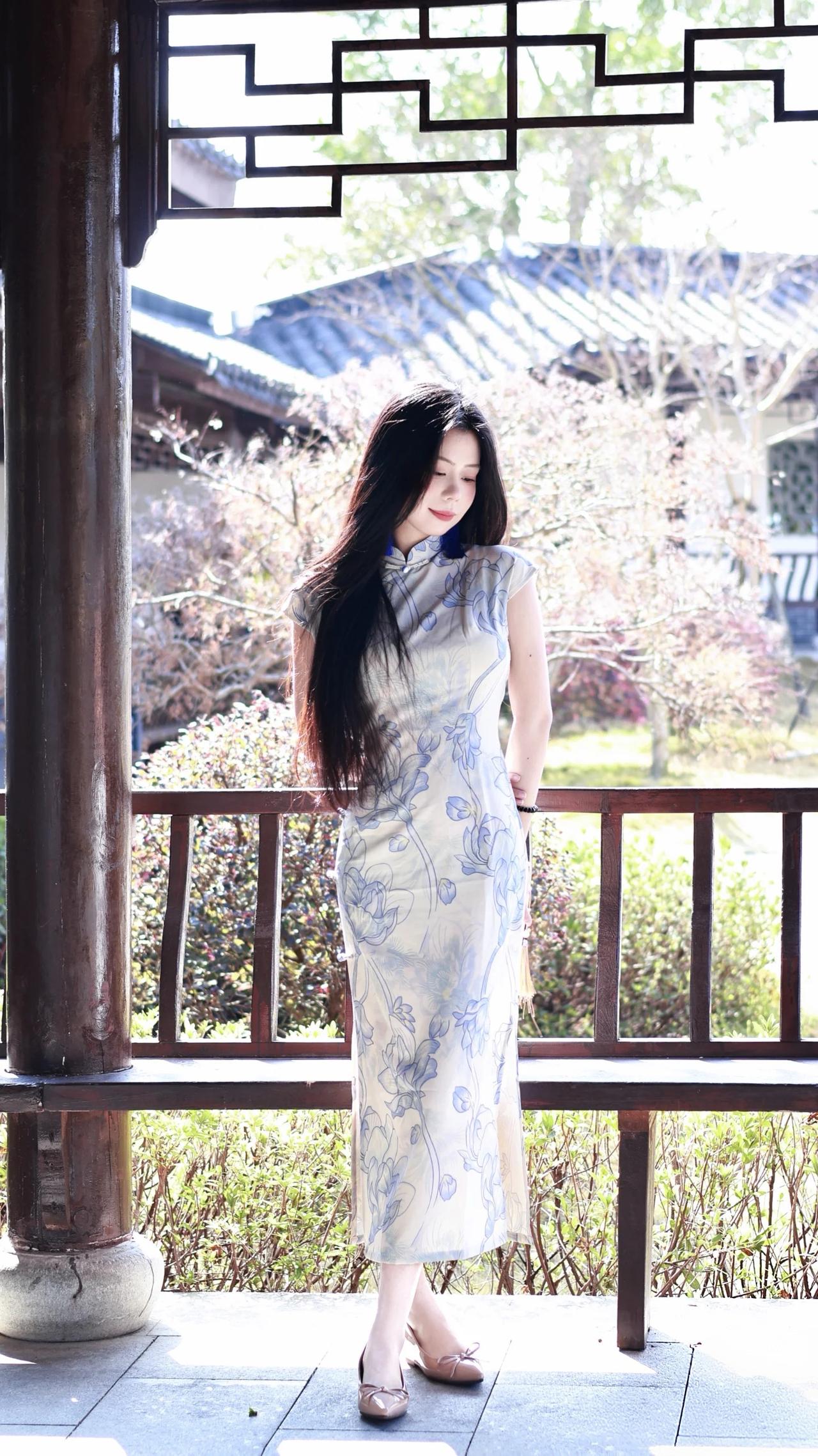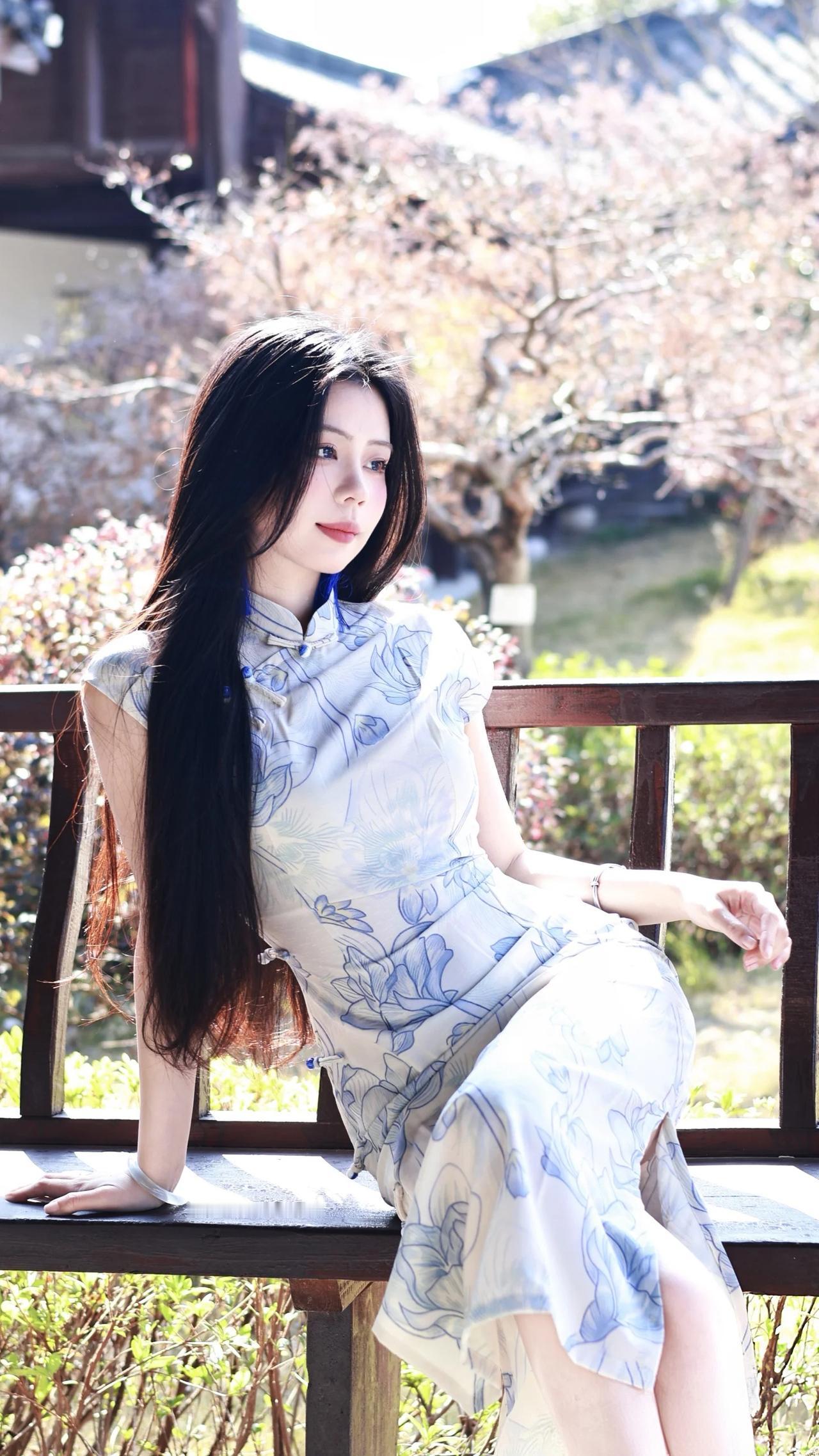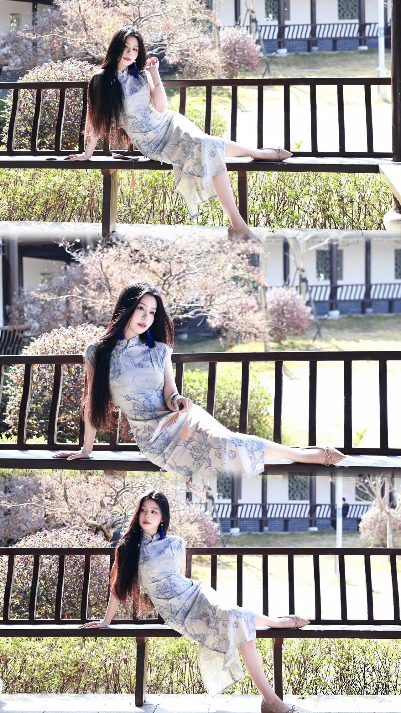 女子身穿浅底蓝花旗袍,搭配蓝色流苏耳饰与浅色高跟鞋,手持折扇,或倚栏、或坐 bench、或回眸,姿态柔美。背景中的中式窗棂、瓦顶与绿植相映成趣,营造出“人在画中游”的古典美感。 这组写真不仅展现了旗袍的东方韵味,也通过光影与构图传递出一种温婉、静谧的审美意境,适合用于文化宣传、个人写真集或传统节日主题内容。
