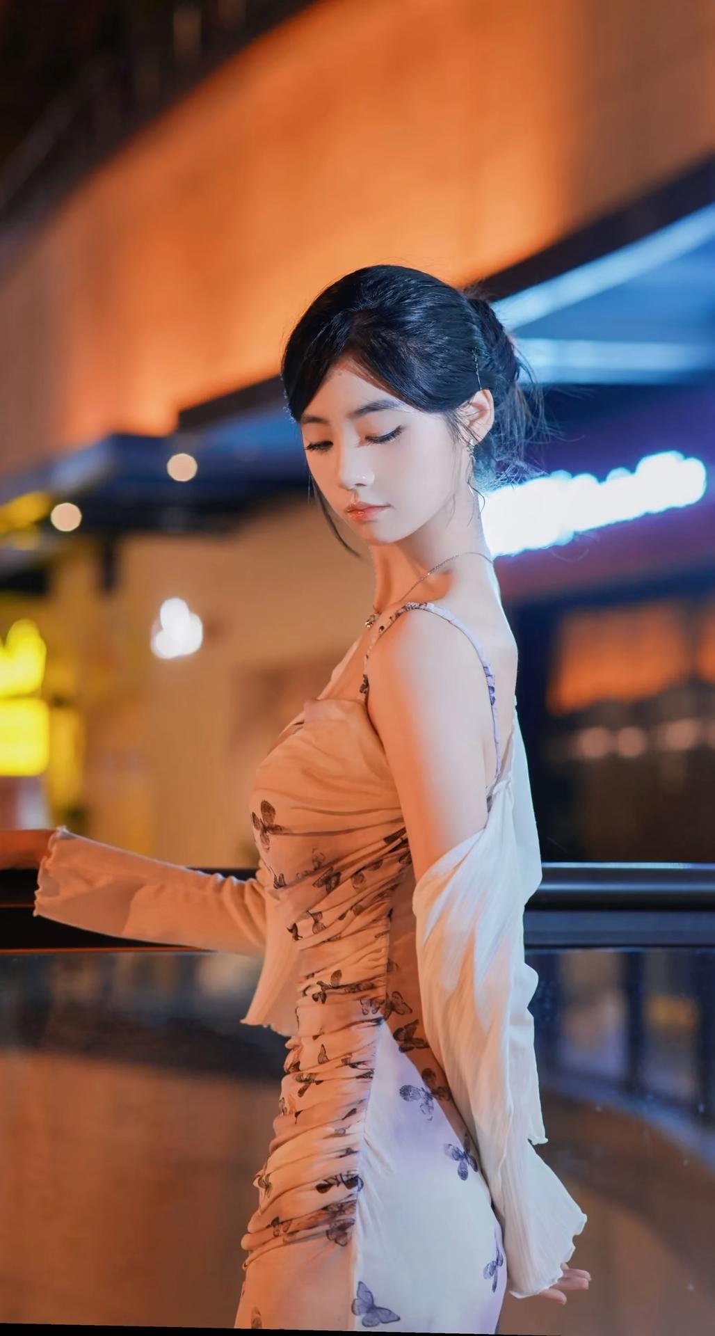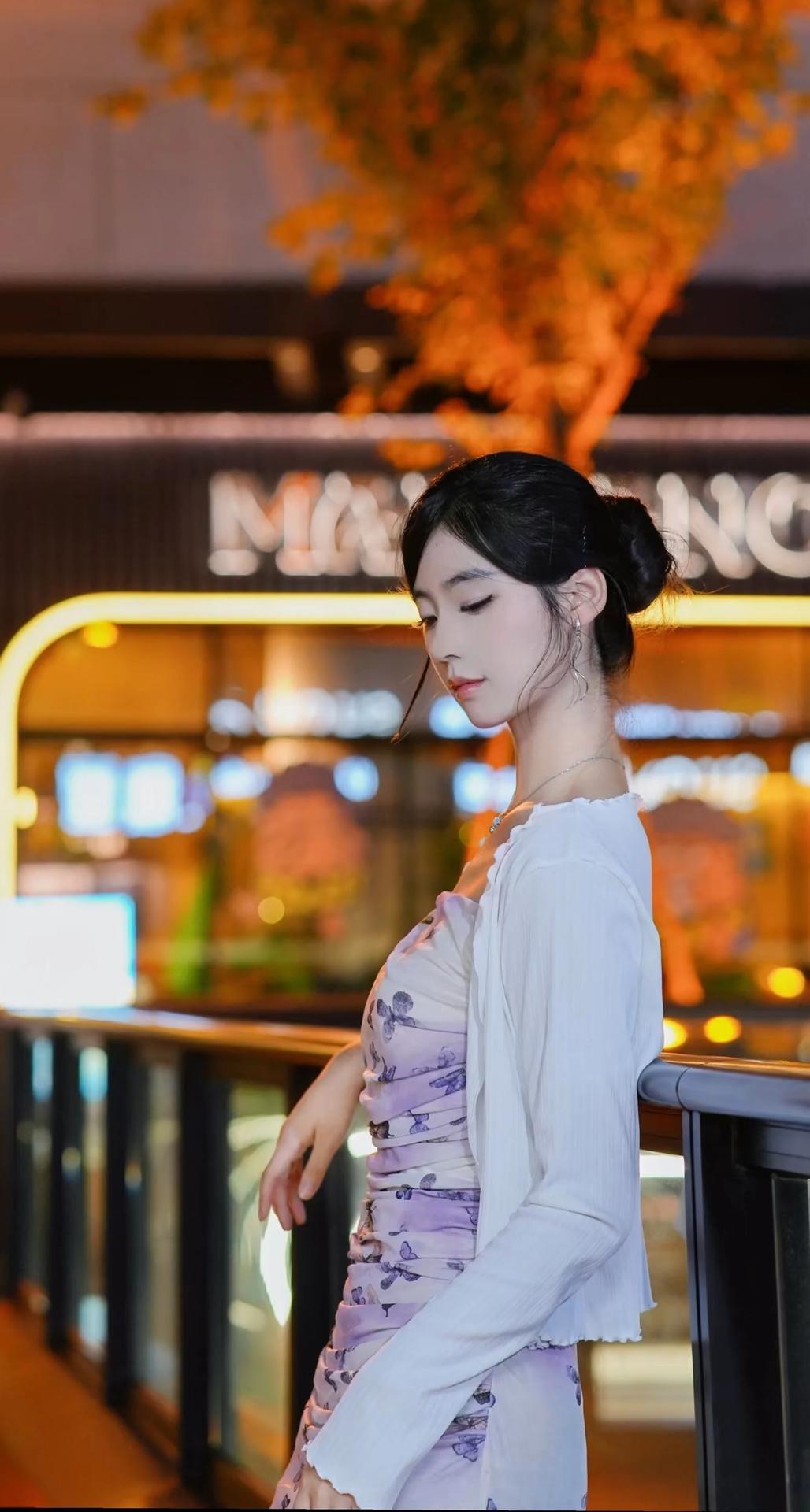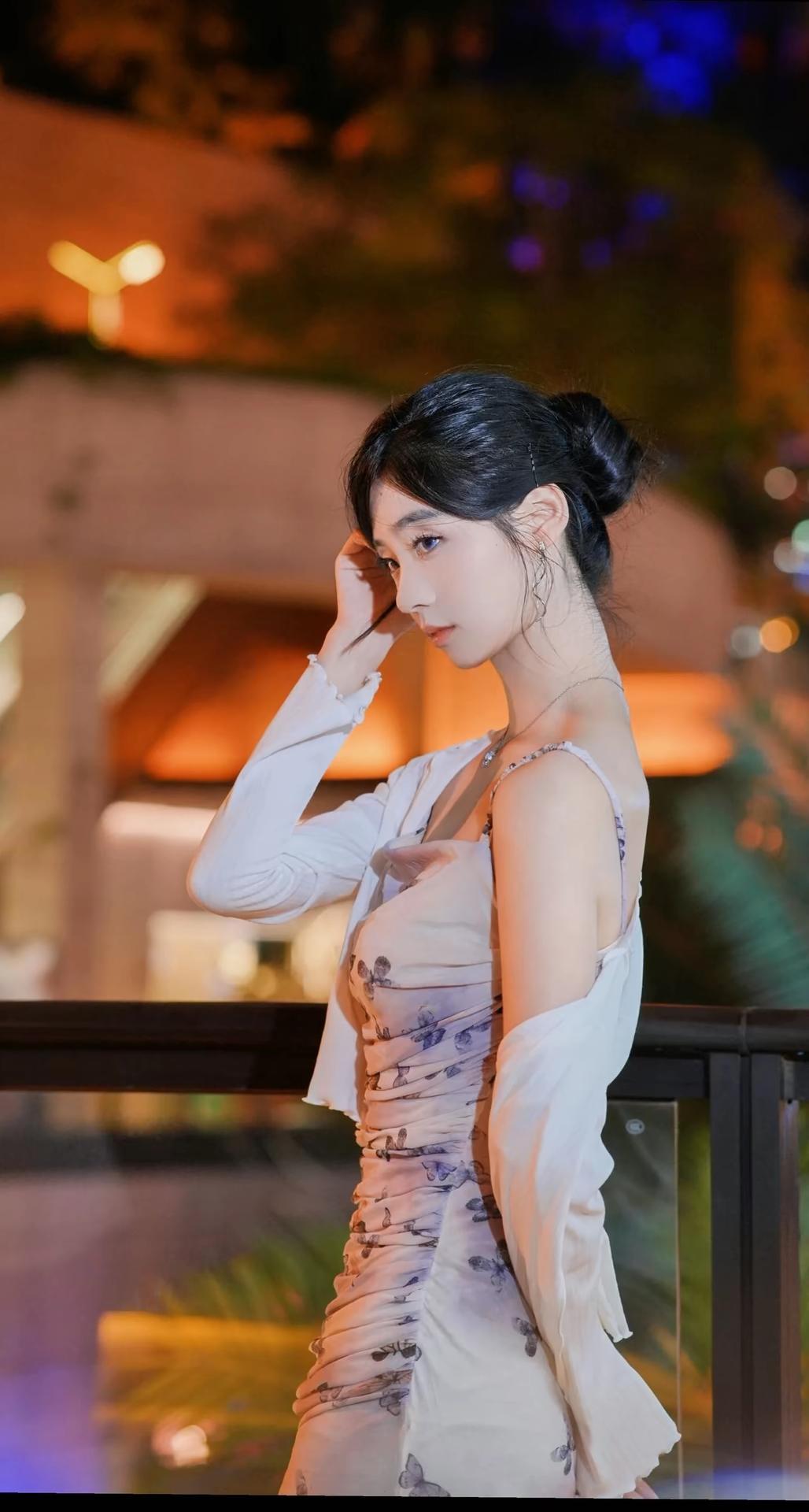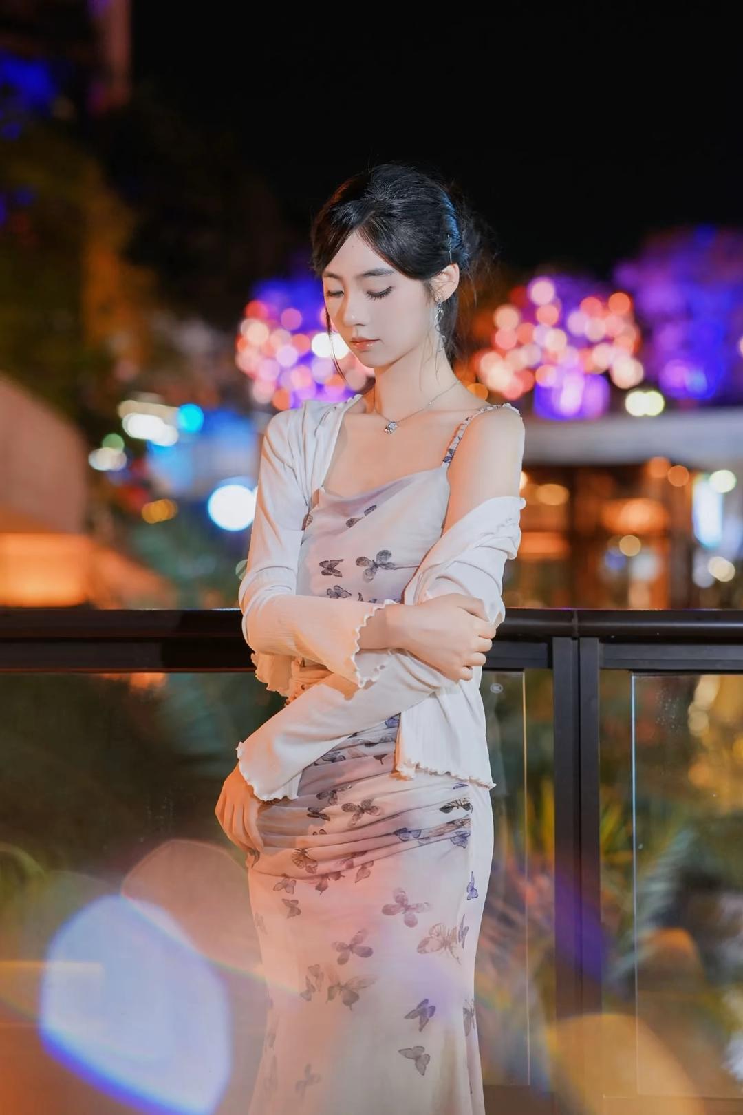 一位身着淡紫色蝴蝶印花吊带连衣裙搭配白色薄纱开衫的女性,在夜晚城市灯光背景下的多角度写真。她将黑发盘起,佩戴简约耳饰与项链,姿态优雅,时而倚栏沉思,时而回眸凝望,整体氛围浪漫而富有都市感。 照片背景中的暖色调灯光与模糊的霓虹光斑营造出梦幻的夜景氛围,与她轻盈的裙装形成视觉上的柔美对比。部分画面中她倚靠在一辆现代感十足的白色汽车旁,手持手机,展现出都市女性的时尚与从容。这组写真不仅捕捉了人物的优雅气质,也通过光影与场景的搭配,传递出一种静谧而迷人的都市夜生活美学,适合用于个人形象展示、时尚穿搭分享或城市夜景主题内容。