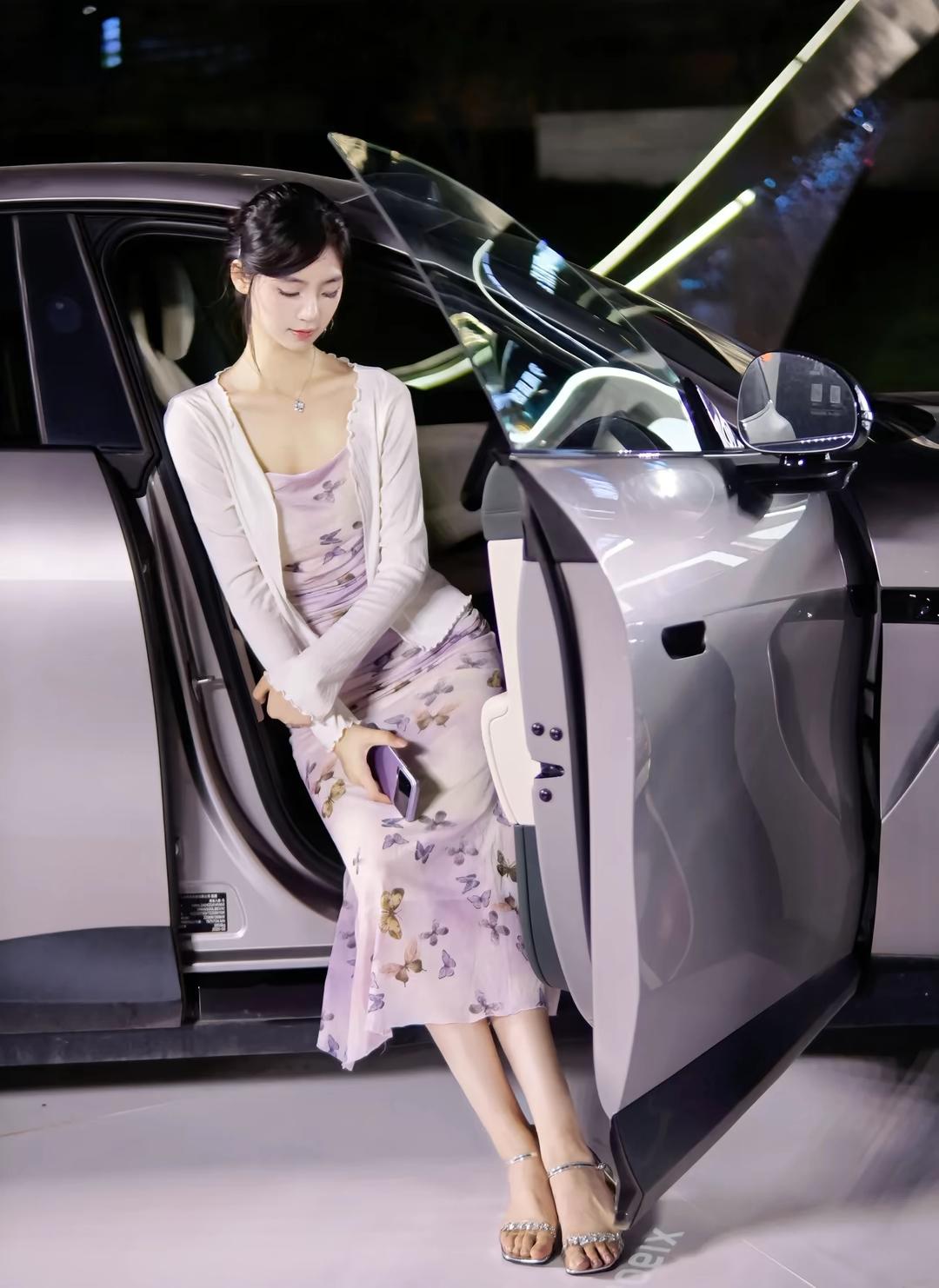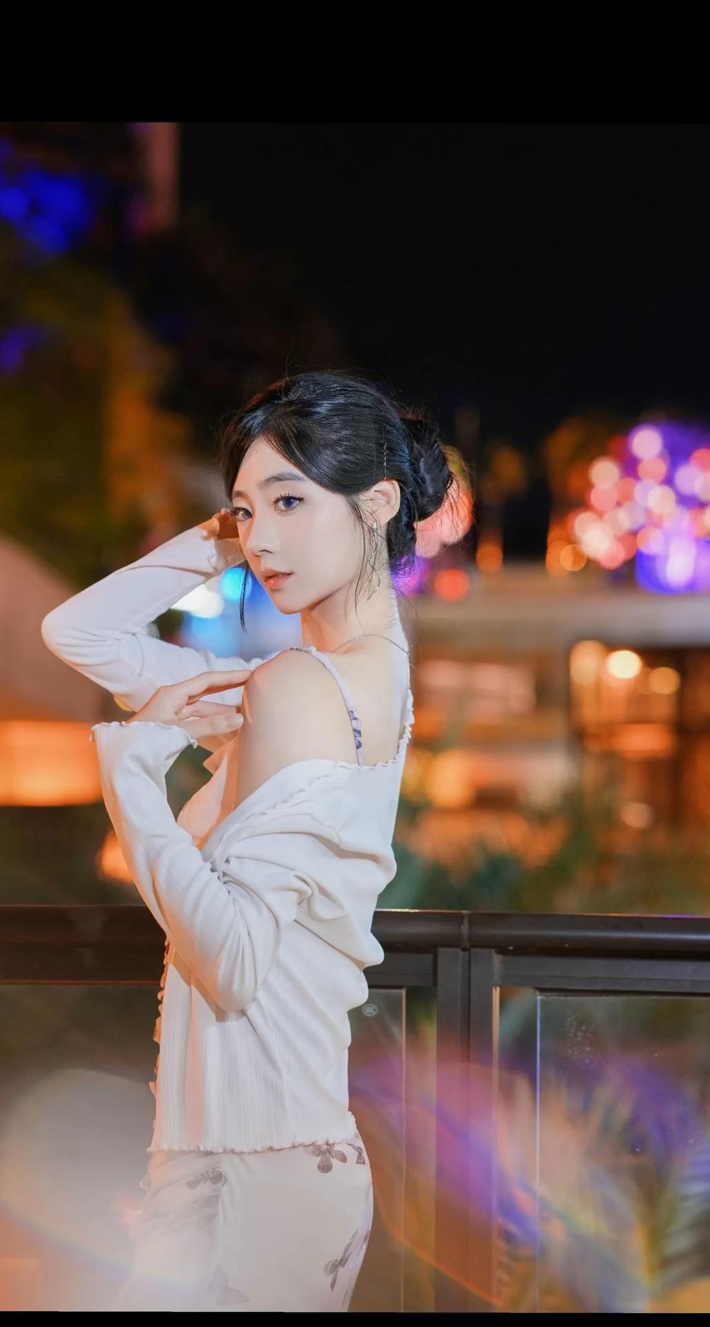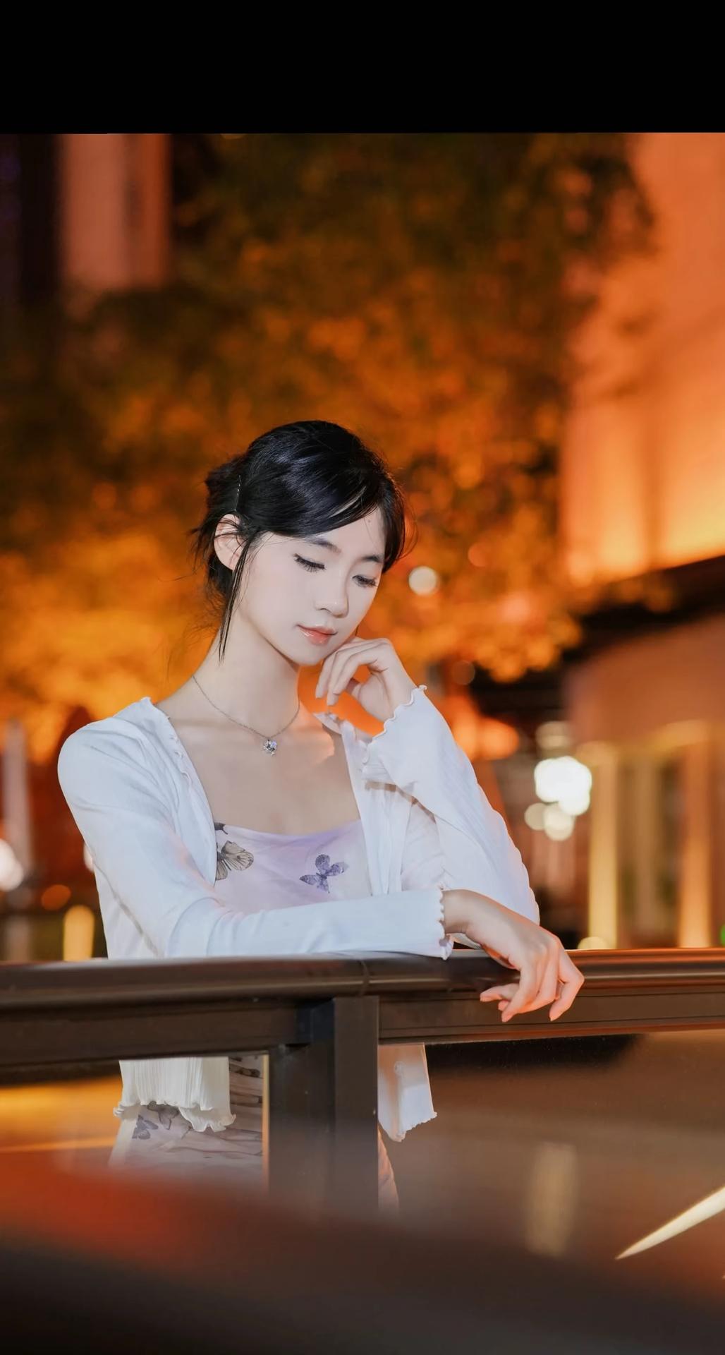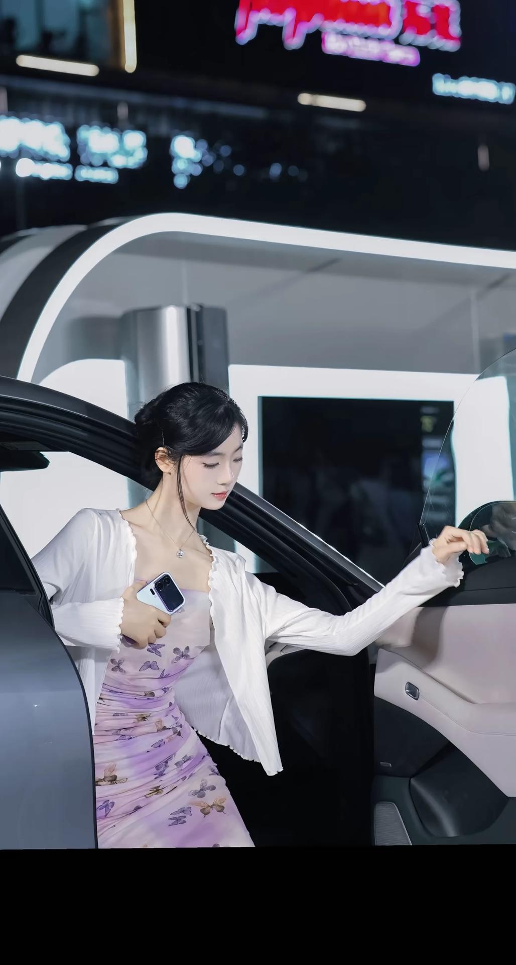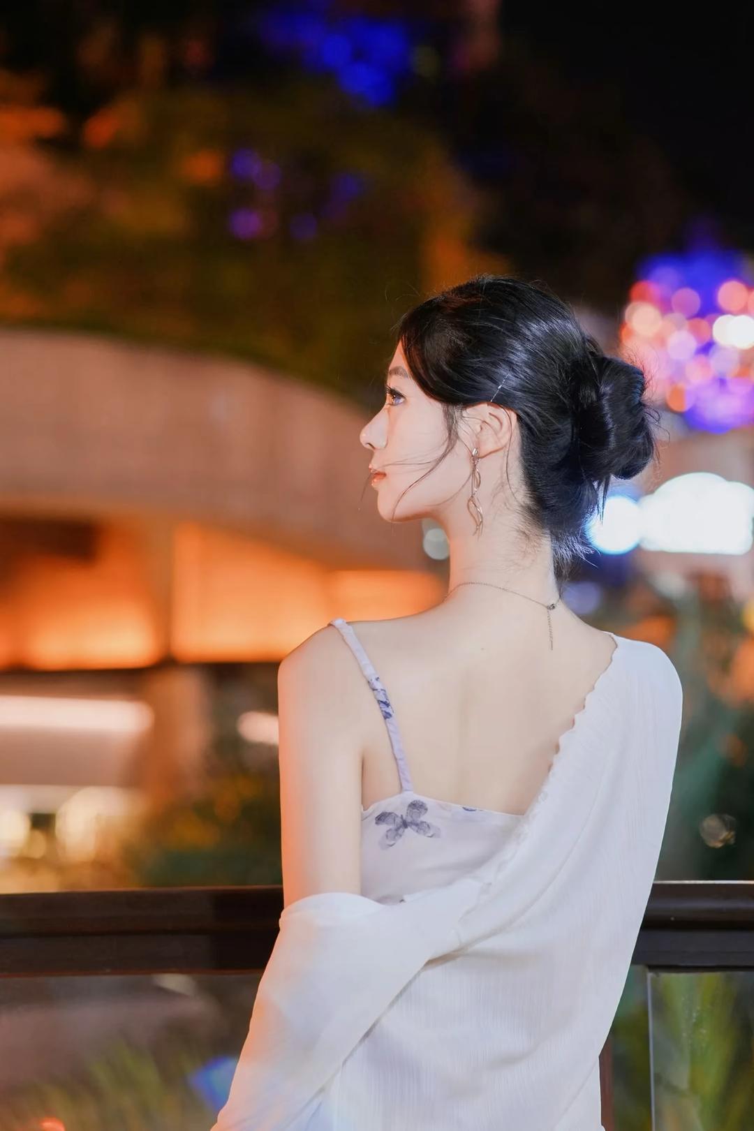 一位身着淡紫色蝴蝶印花吊带连衣裙搭配白色薄纱开衫的女性,在夜晚城市灯光背景下的多角度写真。她将黑发盘起,佩戴简约耳饰与项链,姿态优雅,时而倚栏沉思,时而回眸凝望,整体氛围浪漫而富有都市感。 照片背景中的暖色调灯光与模糊的霓虹光斑营造出梦幻的夜景氛围,与她轻盈的裙装形成视觉上的柔美对比。部分画面中她倚靠在一辆现代感十足的白色汽车旁,手持手机,展现出都市女性的时尚与从容。这组写真不仅捕捉了人物的优雅气质,也通过光影与场景的搭配,传递出一种静谧而迷人的都市夜生活美学,适合用于个人形象展示、时尚穿搭分享或城市夜景主题内容。