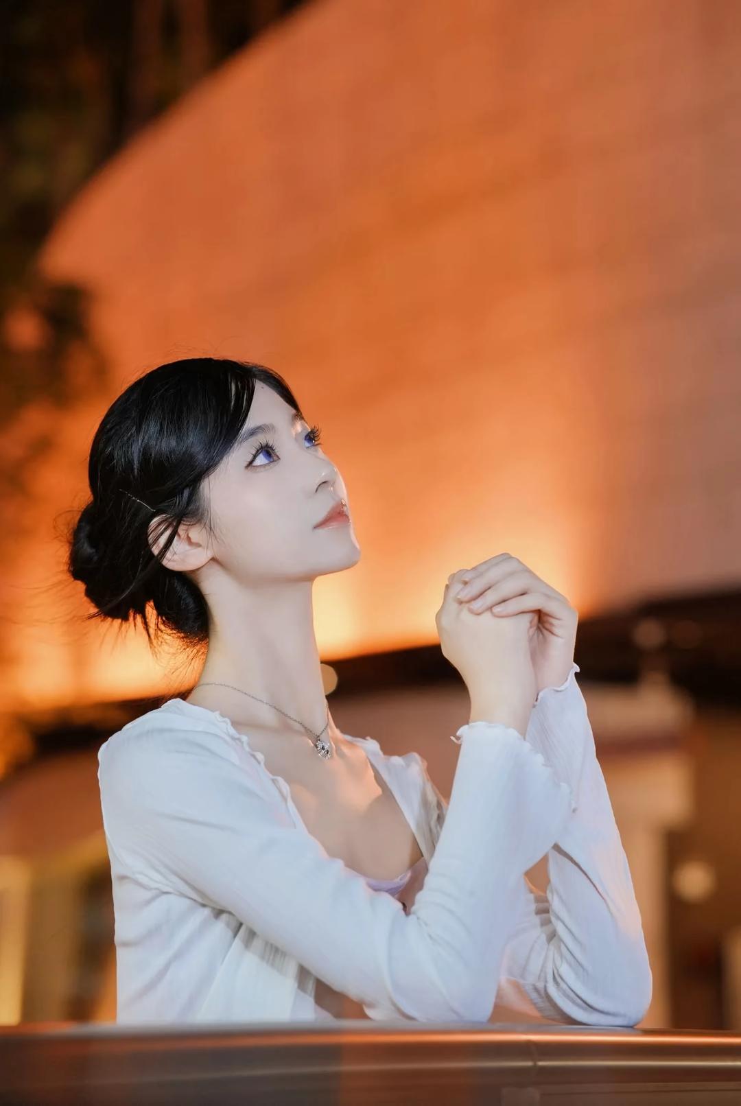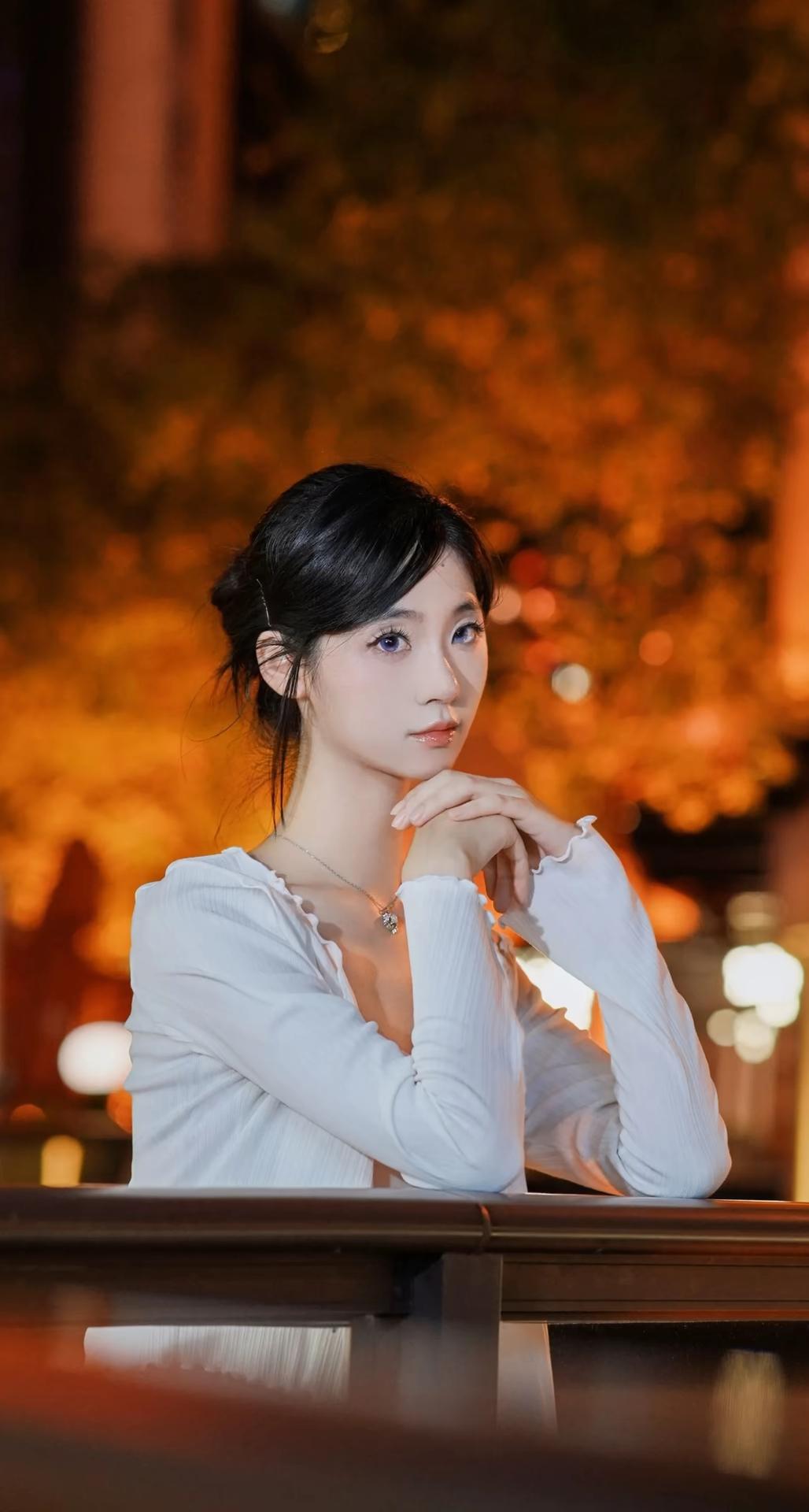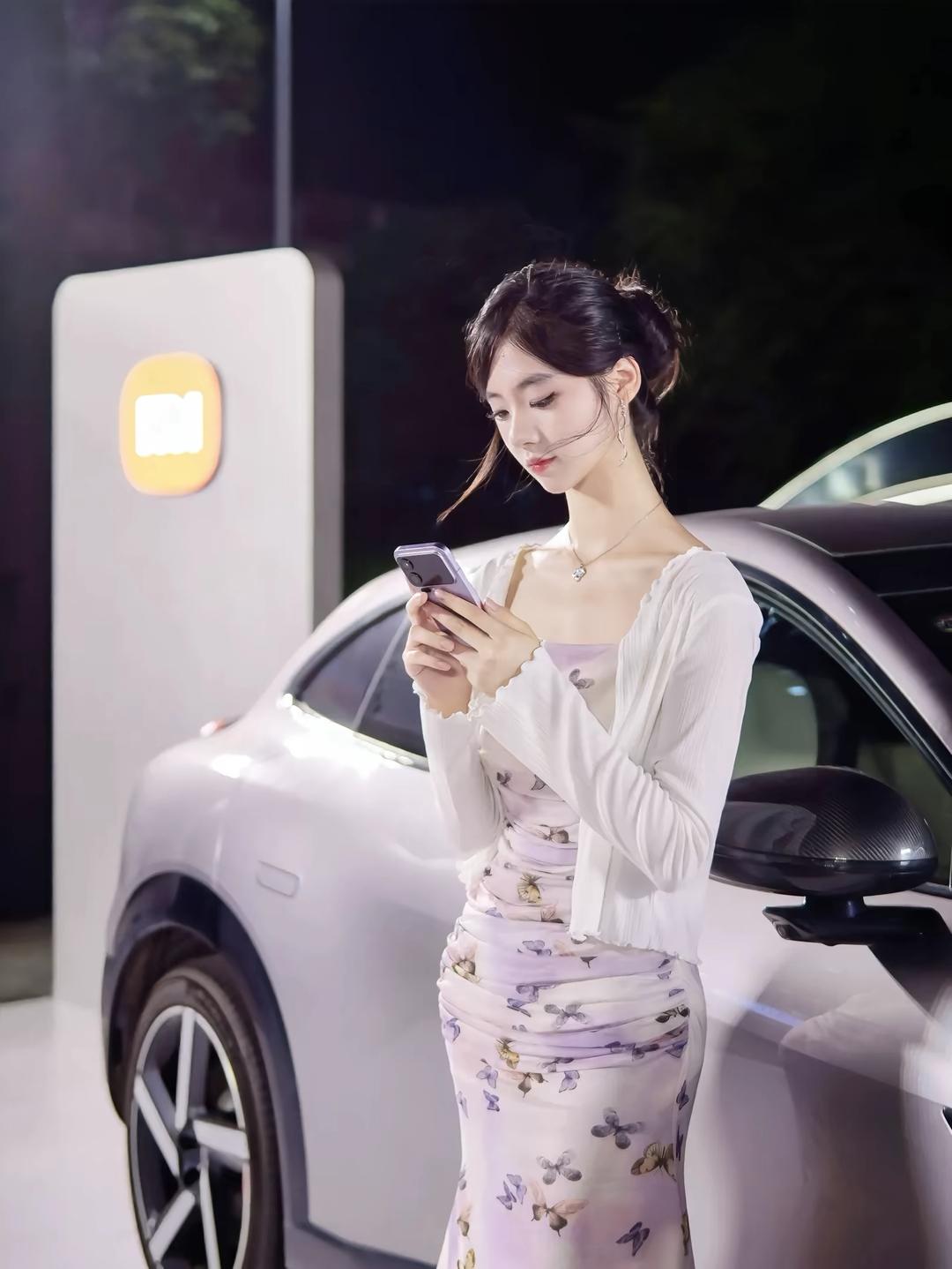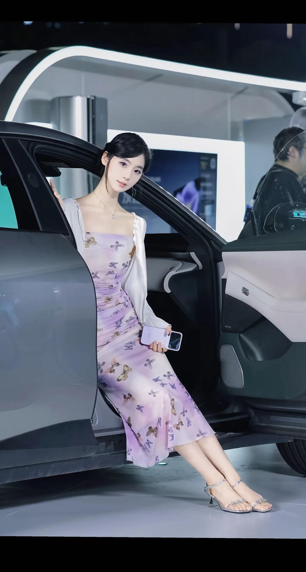 一位身着淡紫色蝴蝶印花吊带连衣裙搭配白色薄纱开衫的女性,在夜晚城市灯光背景下的多角度写真。她将黑发盘起,佩戴简约耳饰与项链,姿态优雅,时而倚栏沉思,时而回眸凝望,整体氛围浪漫而富有都市感。 照片背景中的暖色调灯光与模糊的霓虹光斑营造出梦幻的夜景氛围,与她轻盈的裙装形成视觉上的柔美对比。部分画面中她倚靠在一辆现代感十足的白色汽车旁,手持手机,展现出都市女性的时尚与从容。这组写真不仅捕捉了人物的优雅气质,也通过光影与场景的搭配,传递出一种静谧而迷人的都市夜生活美学,适合用于个人形象展示、时尚穿搭分享或城市夜景主题内容。