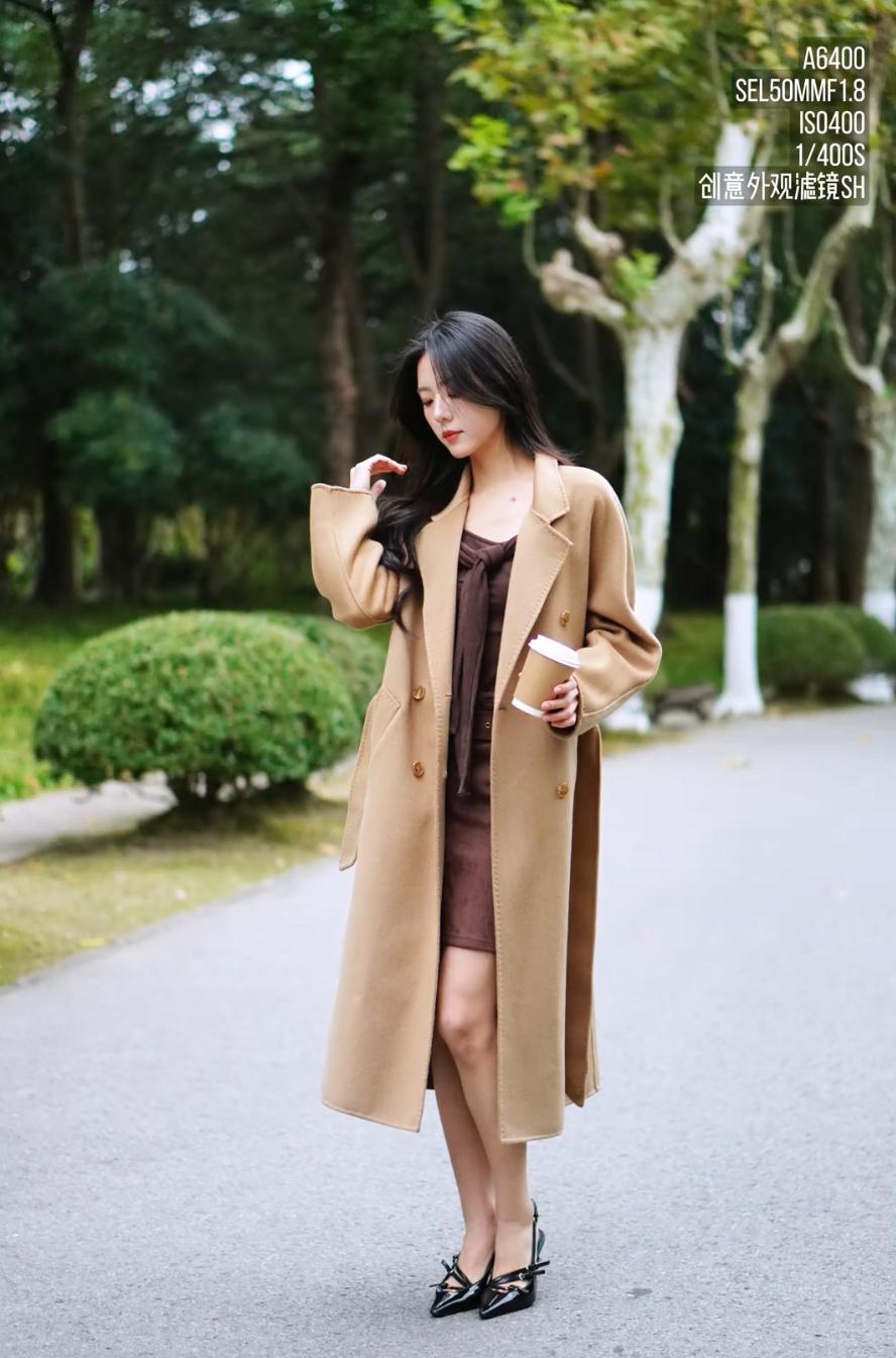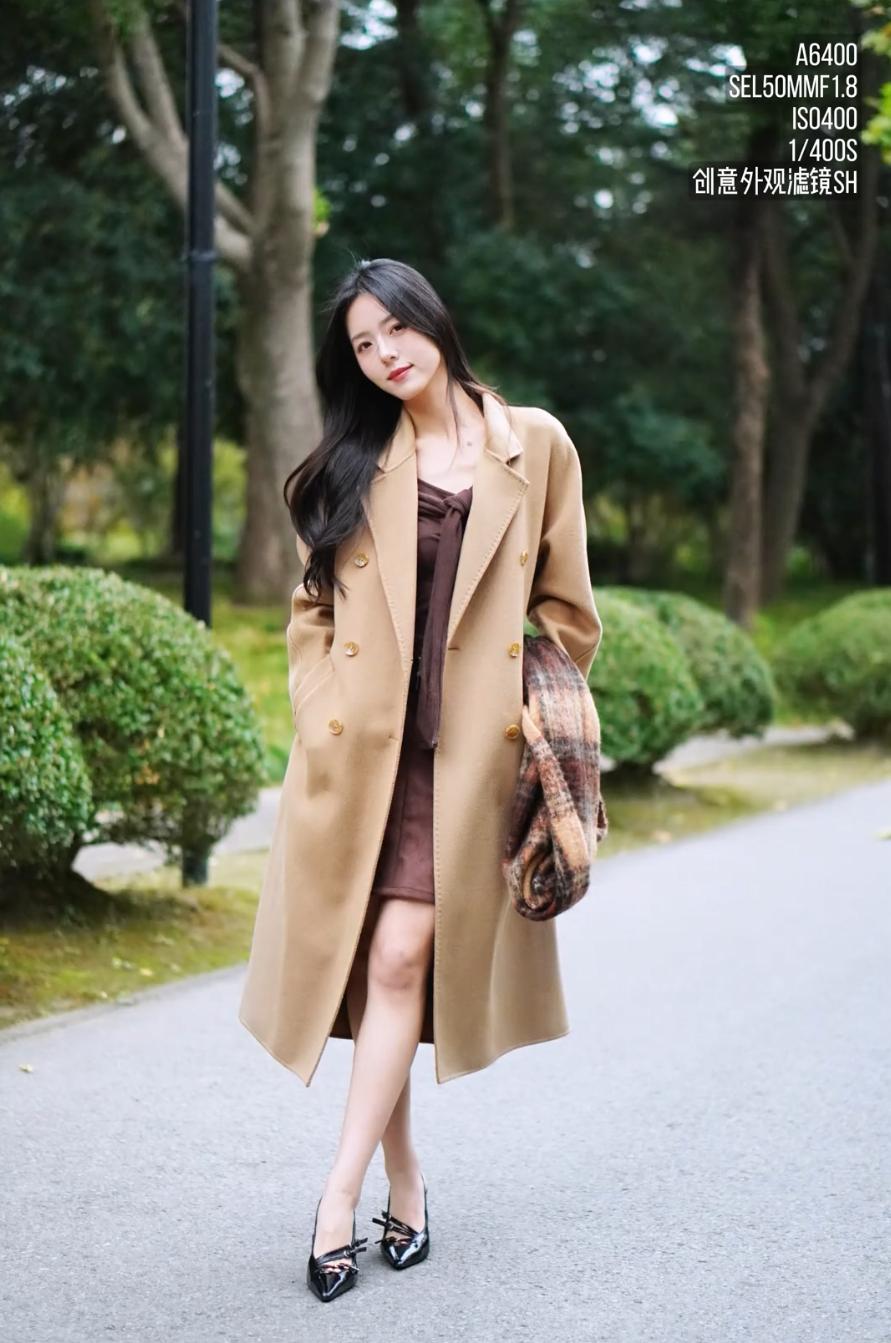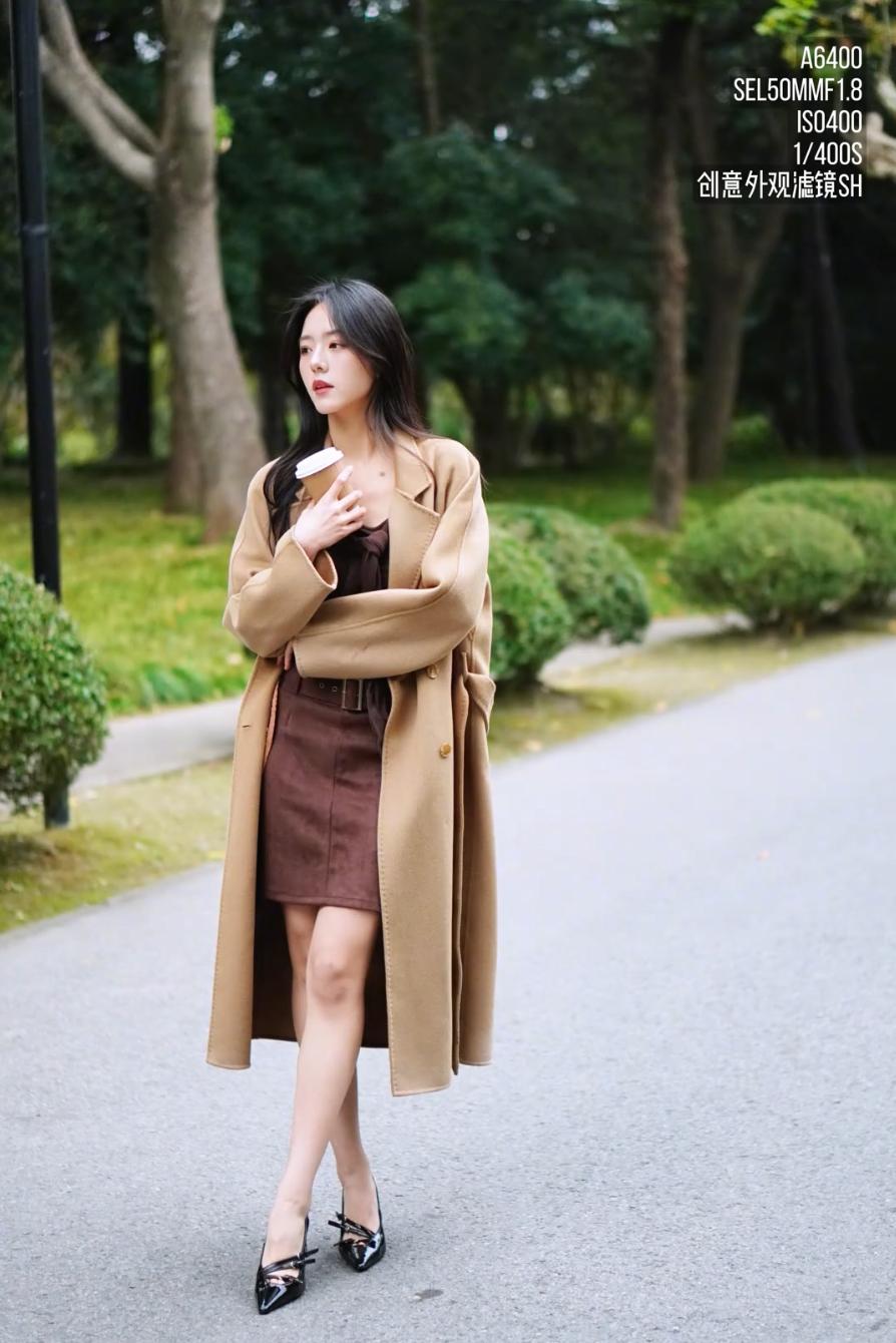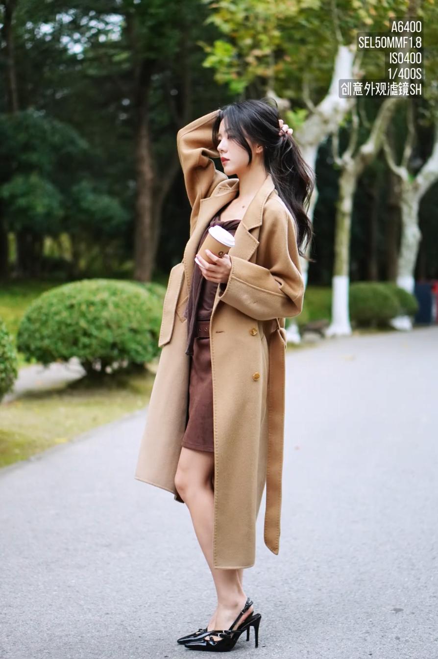 女孩子怎么穿搭既时尚又好看? 秋日的午后,阳光透过树叶洒下斑驳光影,她穿着驼色大衣,内搭棕色系套装,脚踩黑色高跟鞋,手捧一杯热咖啡,漫步在林荫小道上。微风轻拂,发丝随风飘动,她时而低头沉思,时而抬头望向远方,神情恬静而优雅。大衣随步伐轻轻摆动,勾勒出曼妙的身姿,整体造型简约而不失格调,尽显都市女性的知性与温柔。
