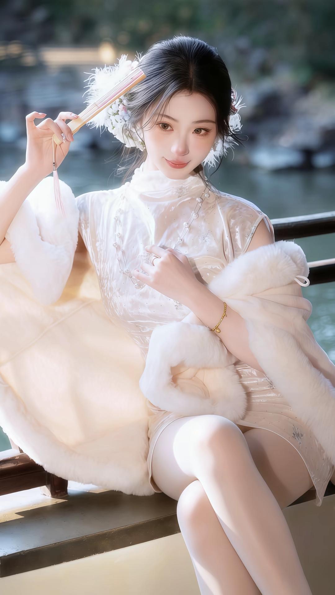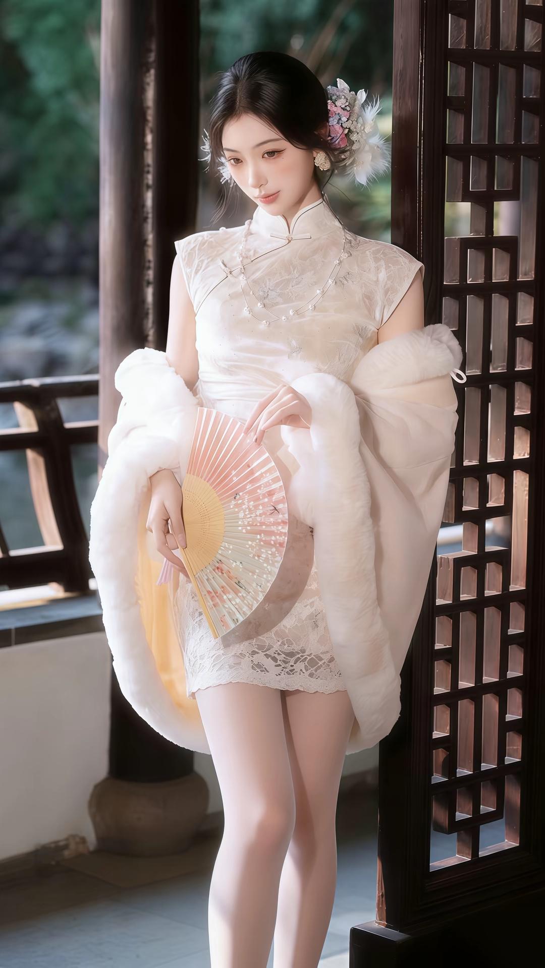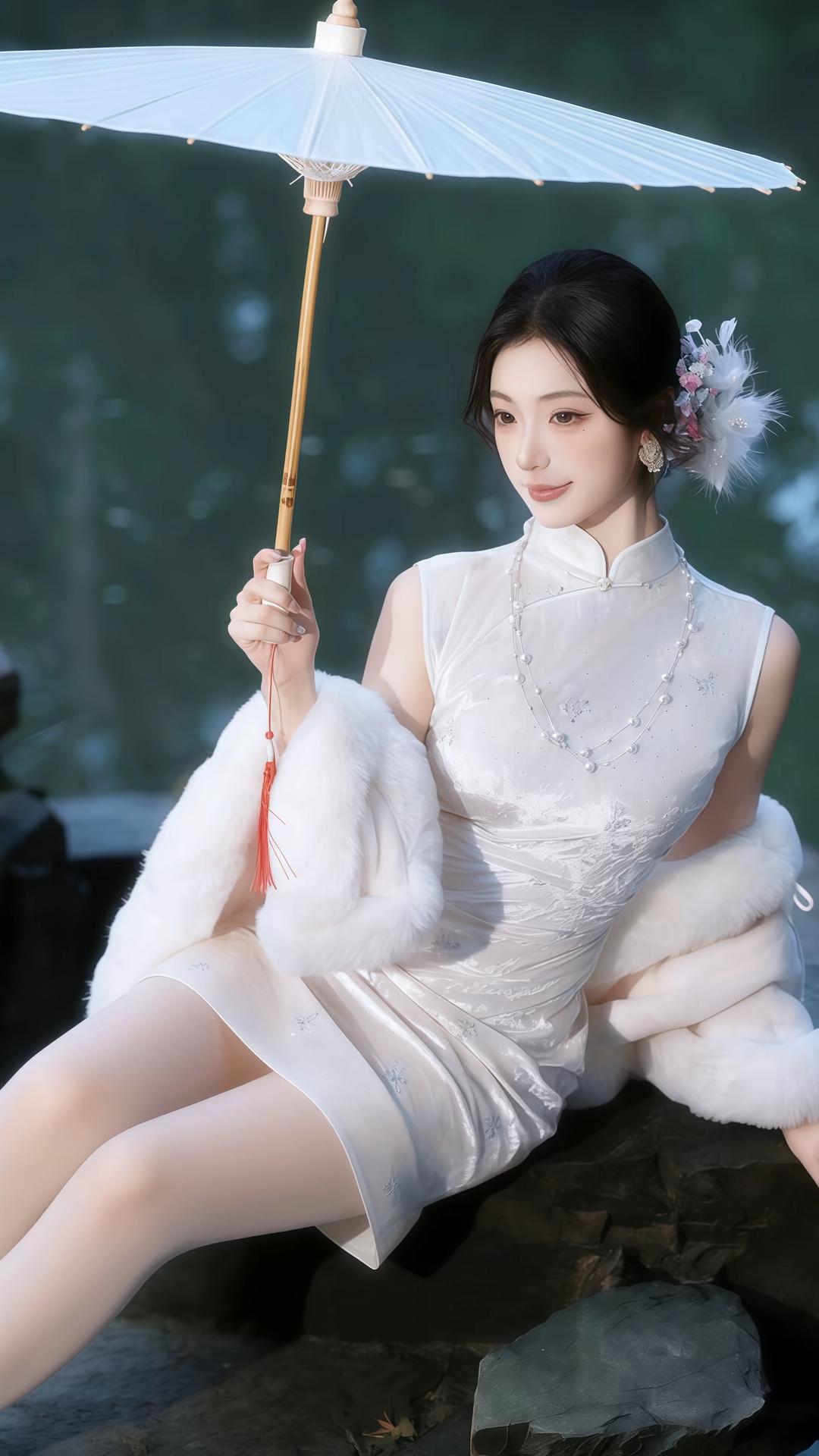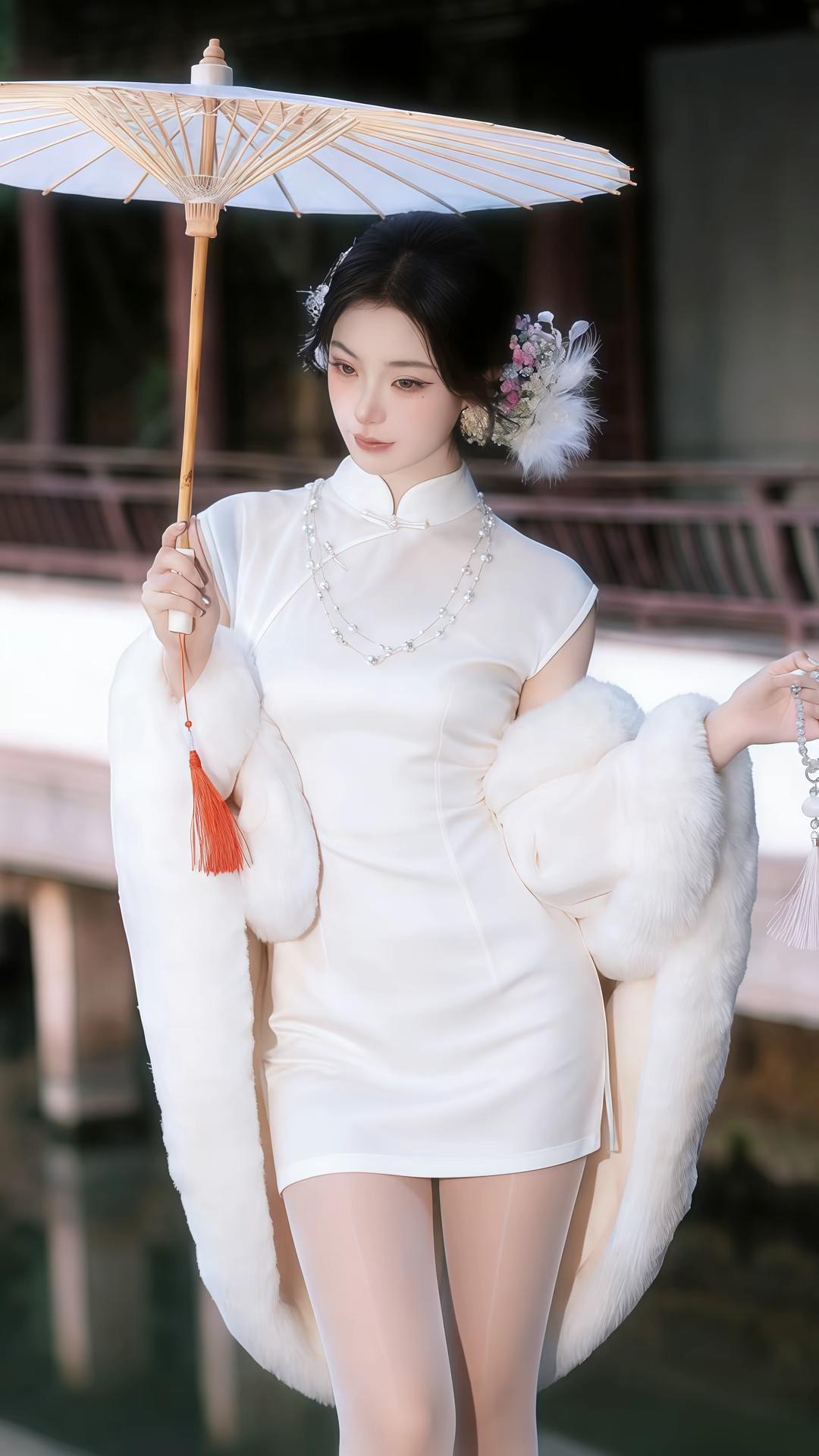 一身素白旗袍,裹着江南烟雨的温婉与矜贵。她立于古亭水榭之间,手持油纸伞,轻纱般的披肩随风微漾,仿佛是从旧时光里走出来的大家闺秀。珍珠项链在颈间流转光泽,发间的花饰点缀着精致与柔美。她时而伫立凝望,时而轻摇折扇,举手投足间,尽是东方女性独有的雅致与风情,将古典韵味与现代审美完美交融,宛如一幅流动的水墨画,诉说着岁月静好的诗意。