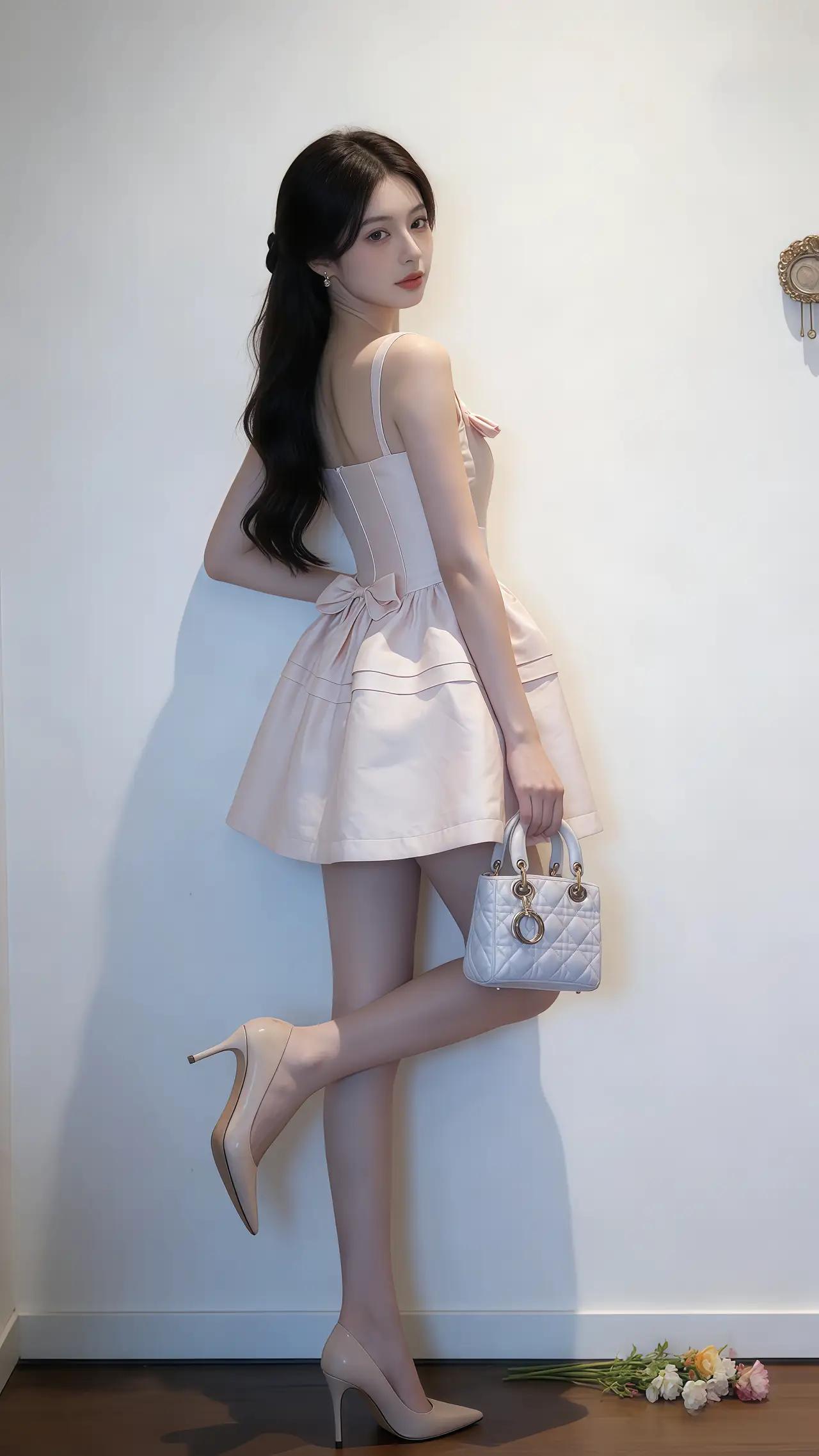 什么样的穿搭可以成为气质女神? 她身穿淡粉色吊带连衣裙,搭配米色高跟鞋与白色手提包,整体造型清新优雅,展现出温柔甜美的气质。 画面中,她时而侧身回眸,时而正对镜头微笑,时而低头阅读,姿态自然灵动。背景为简约的室内环境,墙面干净,地面散落几枝鲜花,增添浪漫氛围。她的长发自然垂落,妆容精致,眼神清澈,整体风格偏向清新甜美与轻熟优雅的结合,非常符合“初恋感”与“富家千金风”的视觉印象。