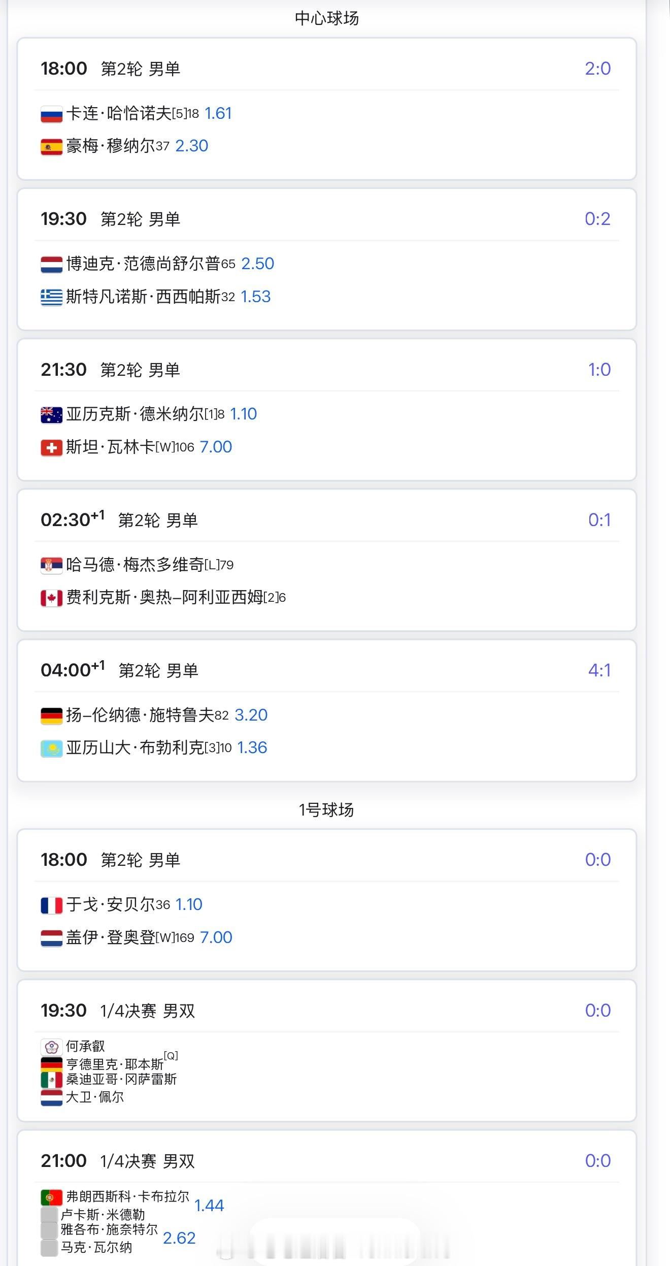 20:00奥斯塔彭科vs科恰雷托21:30斯瓦泰克vs萨卡里23:30莱巴金娜vs姆博科