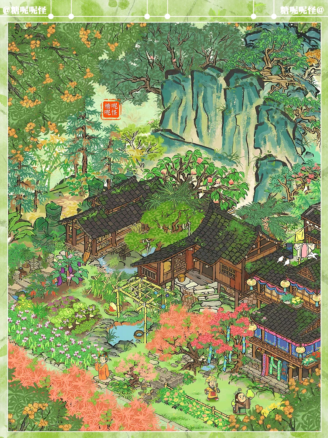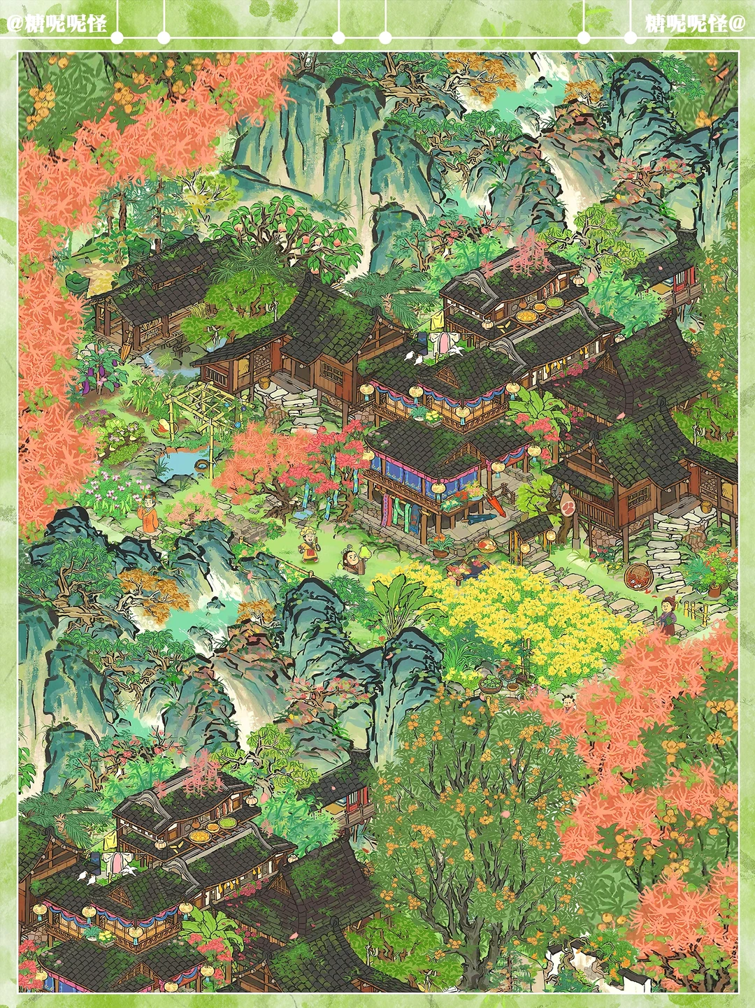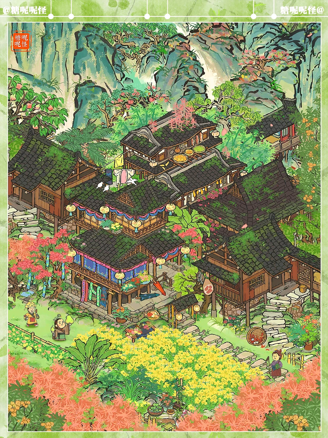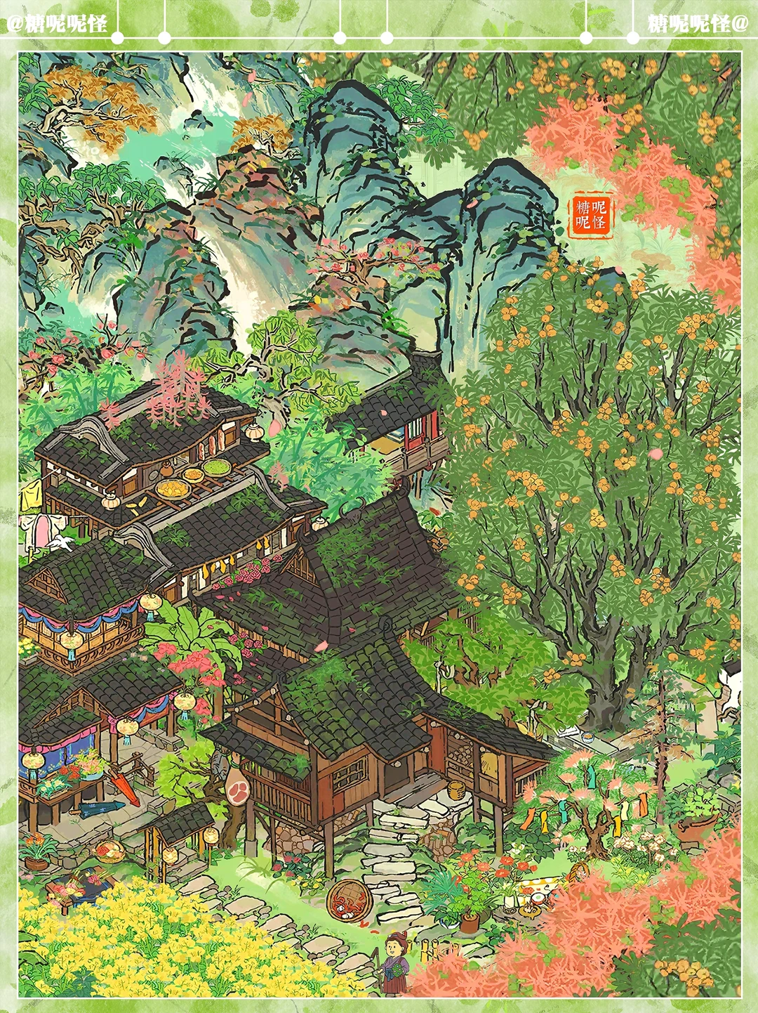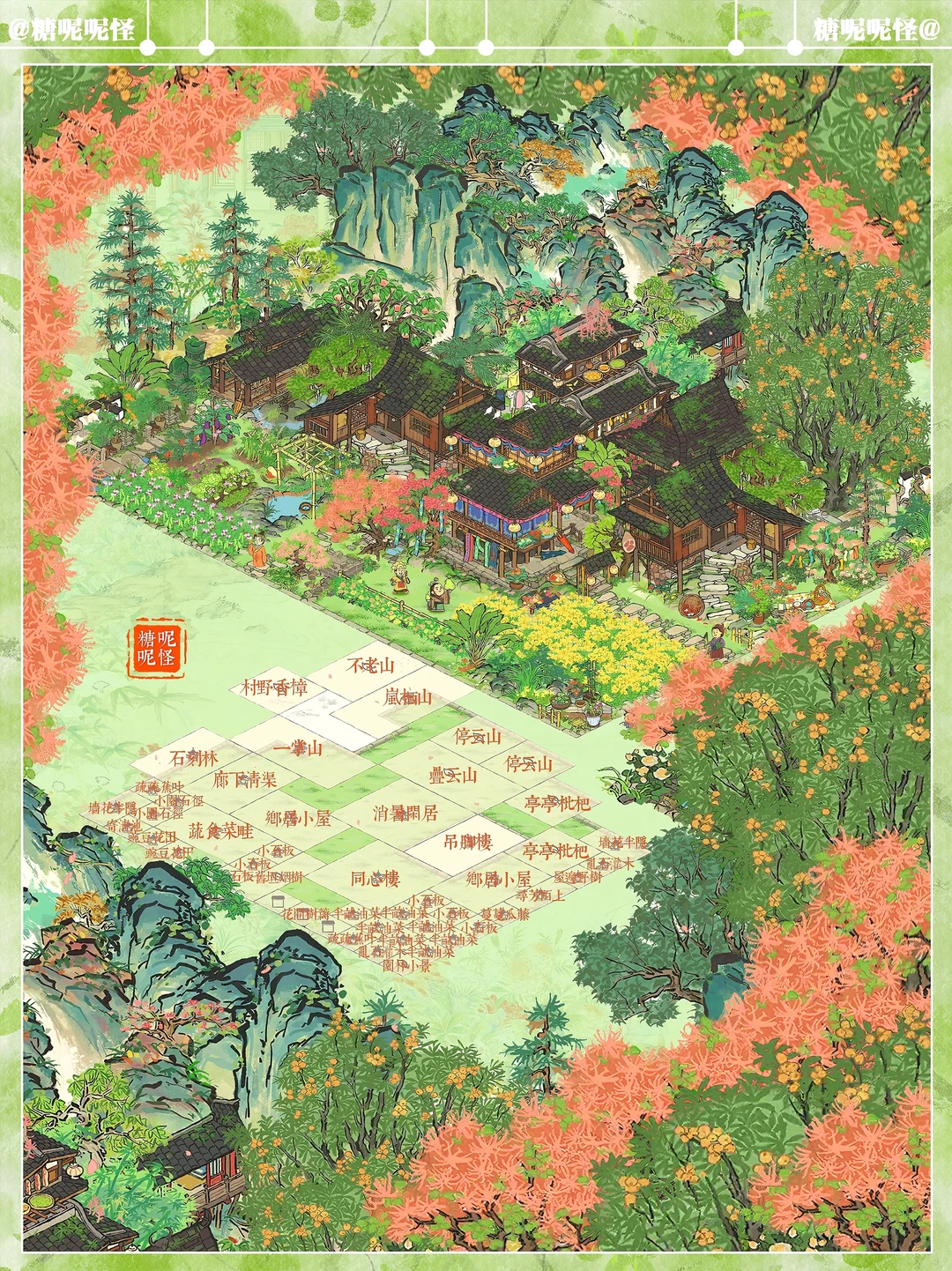 🥰主体建筑:同心楼|乡居小屋|消暑闲居|岚栖山|停云山|不老山|叠云山|一掌山|村野香樟|吊脚楼|亭亭枇杷|廊下清渠|石刻林| 😘搭配建筑:小石板|蔓蔓瓜藤|寻访陌上|墙花半隐|乱石灌木|疏疏蕉叶|豌豆花田|半亩油菜|园林小景|屋边野树|旧垣烟树|寄清池|小园石径