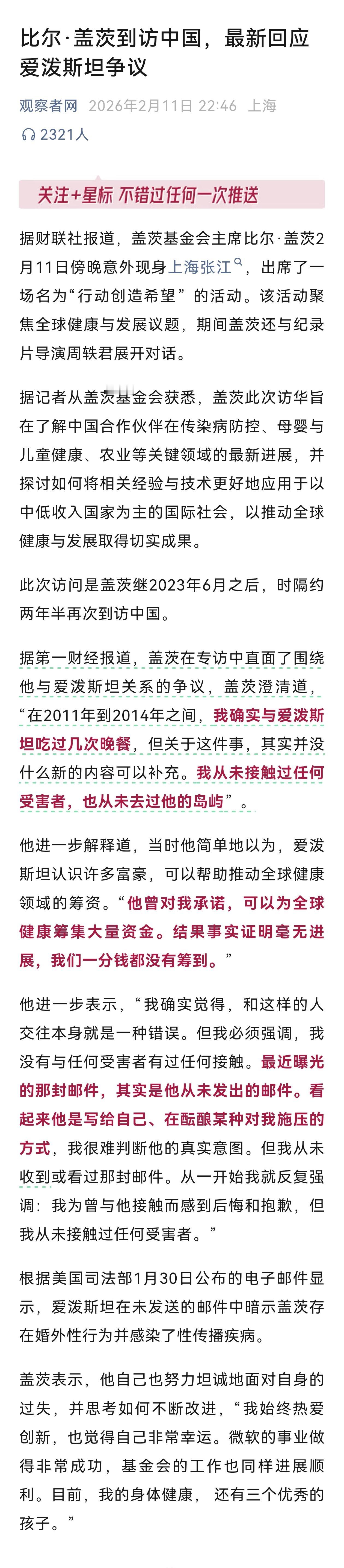 比尔.盖茨在上海再次回应爱泼斯坦邮件。相信盖茨!