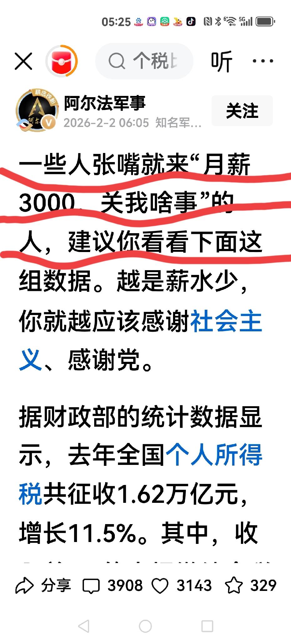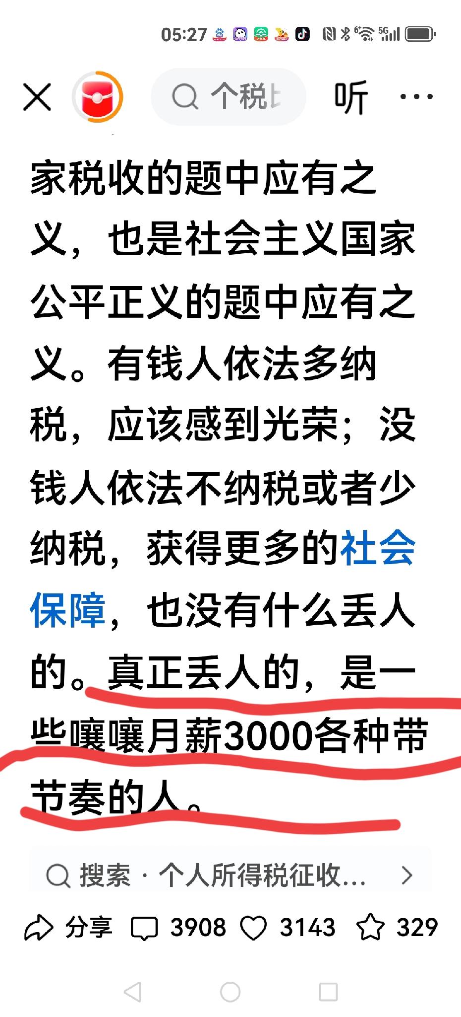 【月薪3000,不能嚷嚷“关我啥事”】 一位博主怒斥一些月薪3000的人,带节奏,瞎嚷嚷,口头禅“关我啥事” 他认为越是薪水少,越是要感谢…………。 越是薪水少,月薪3000的不仅不交税,还要在社会主义的各种转移支付体系内,得到医疗、教育等方面的补助。 也就是有钱人多纳税,月薪3000不纳税,月薪只有三千块 月薪三万真相 这没有什么丢人的,真正丢人的,是一些嚷嚷月薪3000各种带节奏的人。 我只想问问这位博主,你是不是认为美国斩杀线,更让这些3000人懂得感恩? 还有西方规定每小时收入不得低于多少?与月薪3000有什么区别吗? 为什么月薪3000不能发牢骚,不能说:关我啥事?你还要月薪3000怎么样?