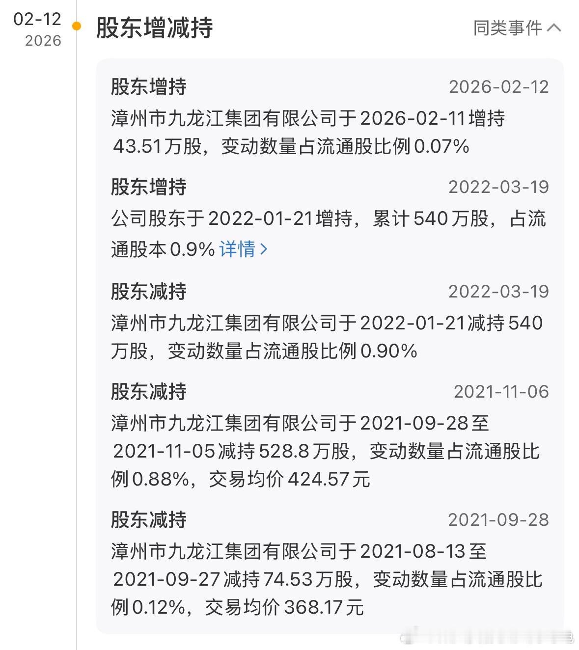 2026.2.11日片仔癀增持了435100股,金额7千多万。这次用自有资金和银行贷款增持,说明集团对片仔癀长期信心很足。九龙江集团这次增持后持股升到51.04%,进一步巩固了控股地位。2025年12月林园说现在市场估值低,我老林10倍的时候就要来了。只买不卖。拭目以待。