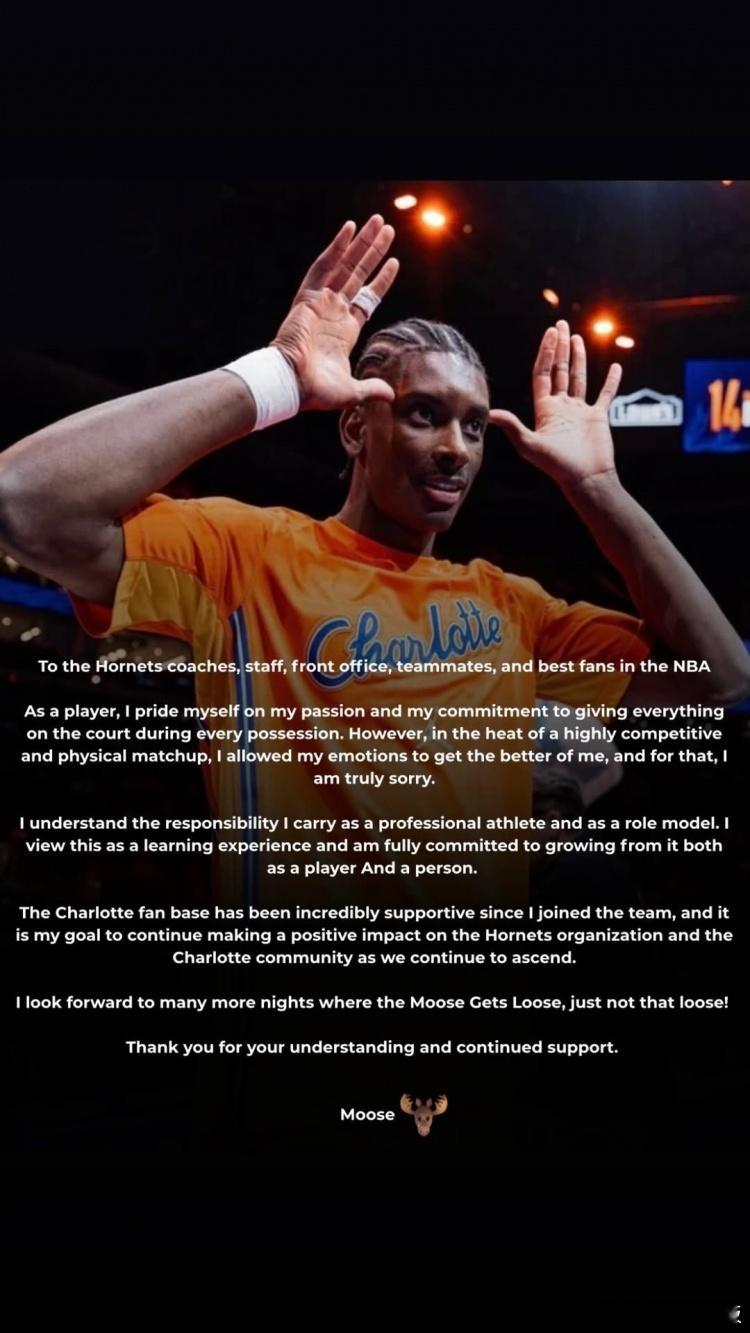 致黄蜂队的教练、工作人员、管理层、队友们,以及NBA最棒的球迷们:作为一名球员,我一直以自己在场上每一次攻防中都全力以赴的激情与投入为荣。然而,在一场竞争激烈、对抗强度极高的比赛中,我没能控制好自己的情绪,对此,我深感抱歉。我深知自己作为职业运动员和公众榜样所肩负的责任。我将这次经历视为一次宝贵的学习机会,并决心在球技和个人修养上都从中汲取成长的力量。自加入球队以来,夏洛特的球迷们一直给予我难以置信的支持。我的目标是,在球队继续崛起的过程中,持续为黄蜂队和夏洛特社区带来积极的影响。我期待着更多“穆萨火力全开”的夜晚,下次不会这么失控了!感谢大家的理解与一如既往的支持。——穆萨🦌