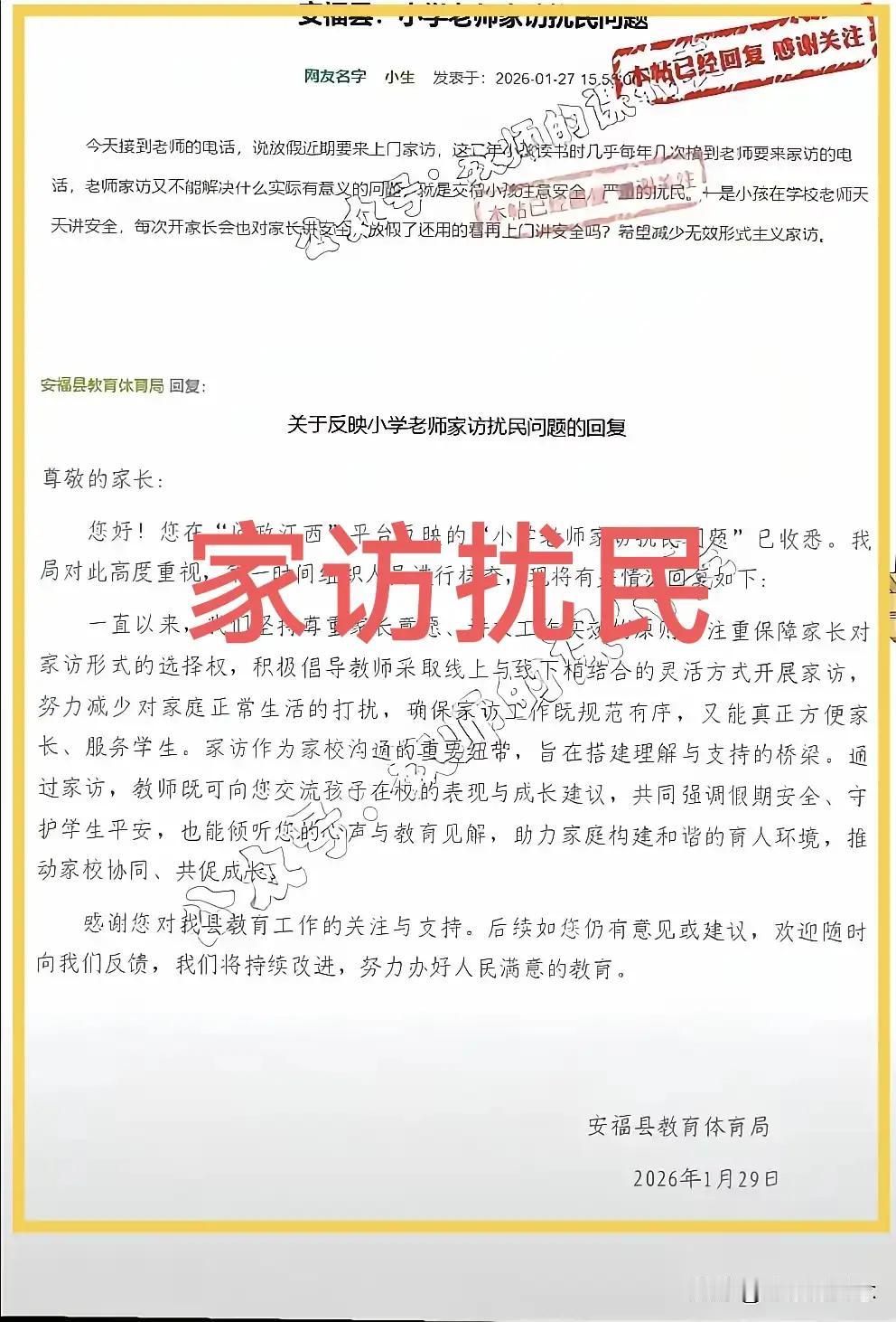 刚才看到一则报道,武汉一所初中的老师,放寒假十多天了300多名老师却依然“全员在岗”,还在完成一项特殊的寒假作业:家访。刚才认真阅读了九派新闻的报道,看着老师们写的密密麻麻的家访记录,心里真的很感慨,也许还有那么一点感动,我也不否认这样的家访比电话家访更注重细节,可能会更有效果。但我真的不支持学校给老师布置这样的“寒假作业",完全不支持,寒假就是寒假,让老师好好调整休息调整一下,放假的时候,好的学校领导是不会去干扰老师的寒假生活的,就是让老师好好休息,来年好好工作。如果真如这则新闻报道,放假十多天了老师还在忙碌家访,这不值得推崇,相关领导应该受到批评。 我一直有一个自己的名言,走上讲台全力以赴,走出校园云淡风轻。上班的时候全力以赴不误人子弟,放假之后云淡风轻享受自己的生活。教书不是生活的全部,学生也不是生活的全部。休息好才能工作好,这是有逻辑关系的。疲于奔命的老师,不可能拥有好的精神状态的。 那边有家长投诉老师家访扰民,其实我觉得投诉是有道理的,并不是所有家长都欢迎老师面对面家访,也并不是所有学生都需要面对面家访。教育