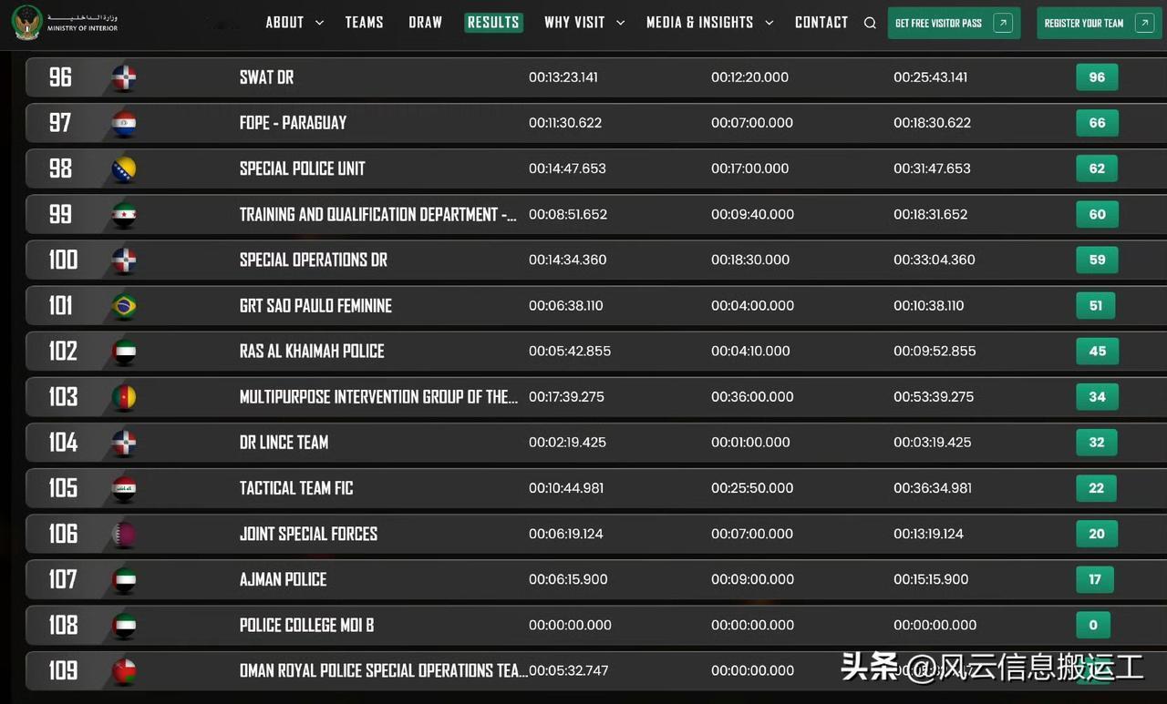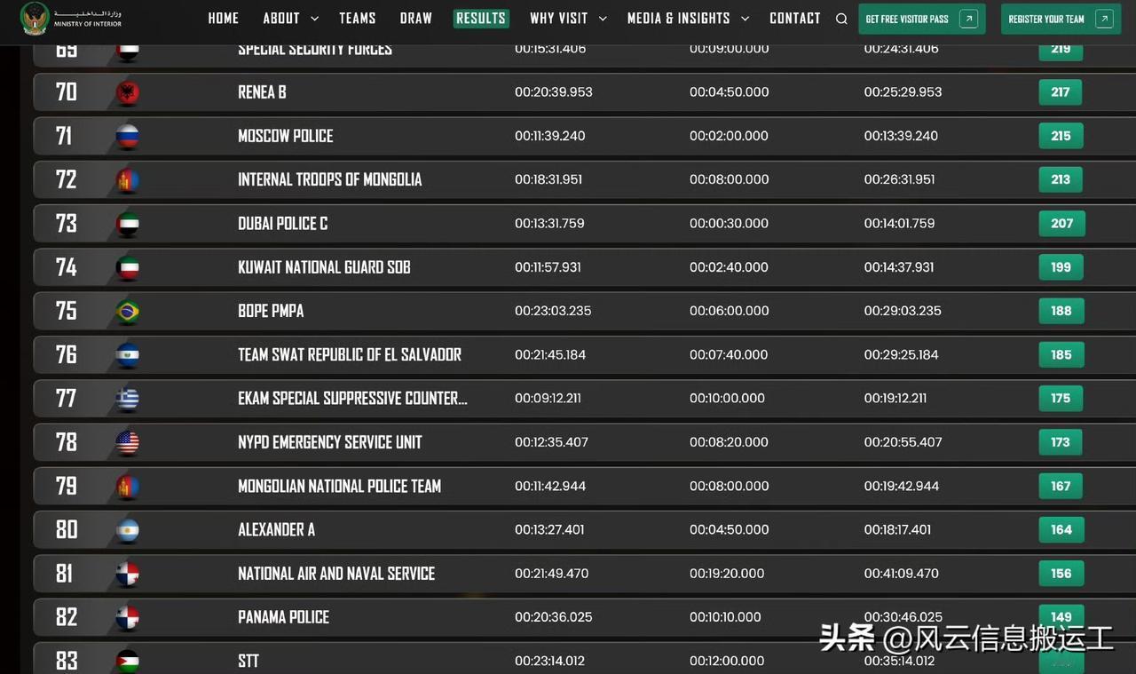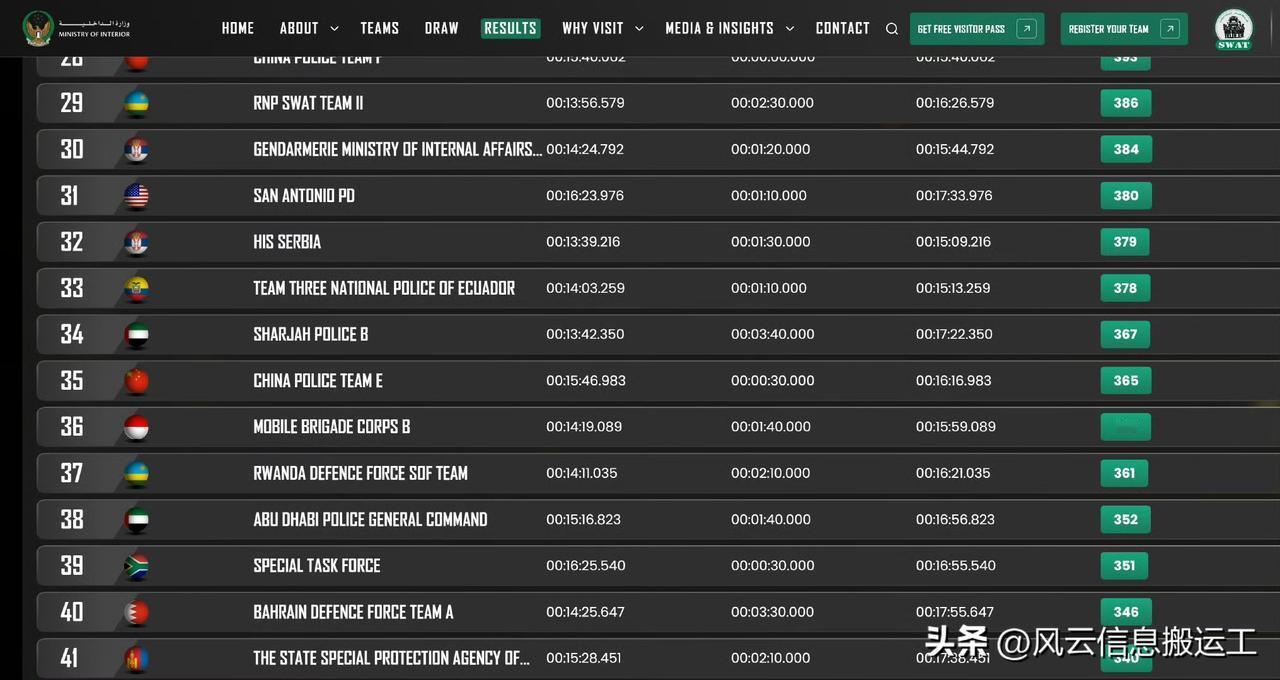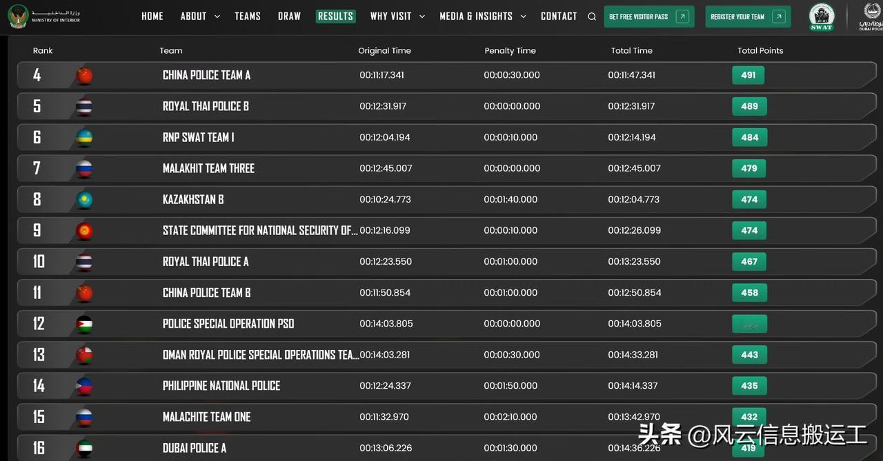 2026年阿联酋特警挑战赛最终排名: 中国 C 队(江苏):总分第三 中国 A 队(特勤):总分第四 中国 B 队(浙江):总分第十一 中国 D 队(新疆):总分第十七 中国 F 队(四川女队):总分第二十八,女队第二 中国 E 队(特勤女队):总分第三十五,女队第三
